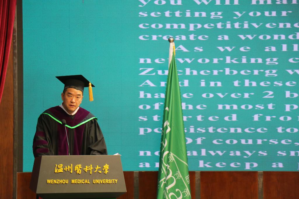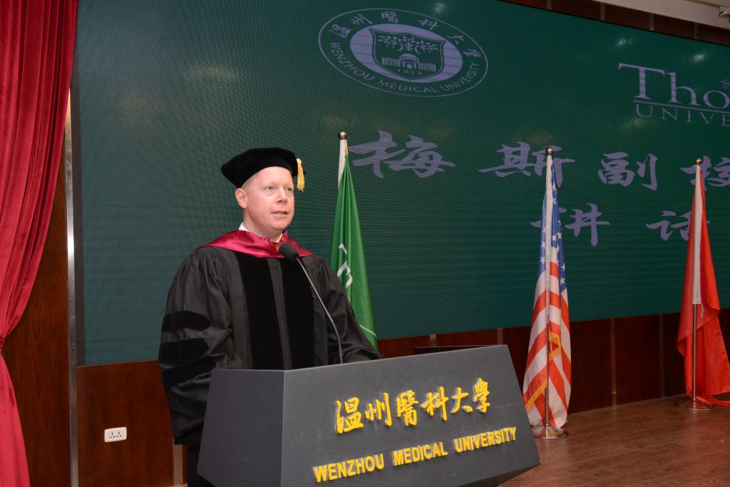 典礼上,曹建明副校长表达了对美方领导和教授们的感谢,对毕业生的肯定和祝贺,并鼓励毕业生们积极展现当代青年的责任和担当。约翰.梅斯副校长现场宣读了该校谢普德校长为托马斯中国合作办学项目(2014-2018)级毕业生写的典礼演讲词,指出“在辩证中,我们会经历许多挣扎和矛盾,但如果你善用这种辩证,你将会获得更多的成功。这意味着你可以成为克服世界上许多造成困扰缺陷的正面力量。”其后,黄磊康博士代替美国托马斯大学中国总校区黄天中校长发表贺词,鼓励护理学子培养学习爱好,发展终生学习,提升自我能力,勇于面对困难,对追求的事物永保活力。毕业生代表李冰蕾在发言中,表达了对四年来一直陪伴的老师同学的感谢,并对创新思维在护理工作中的应用进行了探讨。