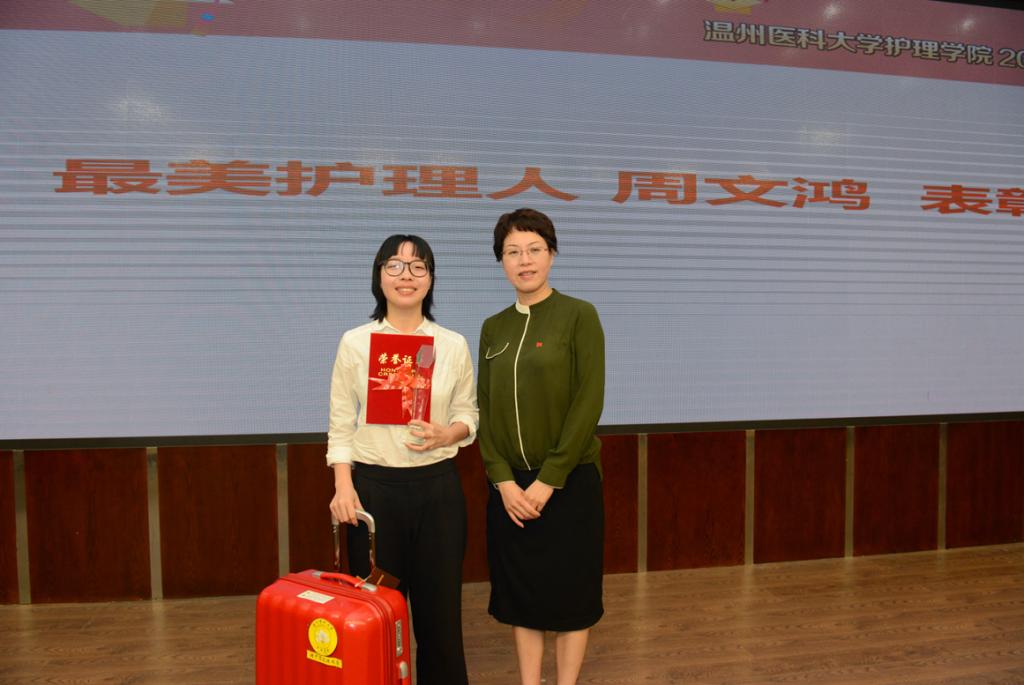现场,19名浙江省优秀毕业生、10名52AV 雪伦考研奖获得者受到表彰。特别值得一提的是,今年的毕业生中,周文鸿同学选择去西藏那曲服务五年,学院党委陈慧书记为其颁发“最美护理人”奖杯和荣誉证书,并送上装满祝福和希望的行李箱,希望其在祖国的西部挥洒青春,报效国家。