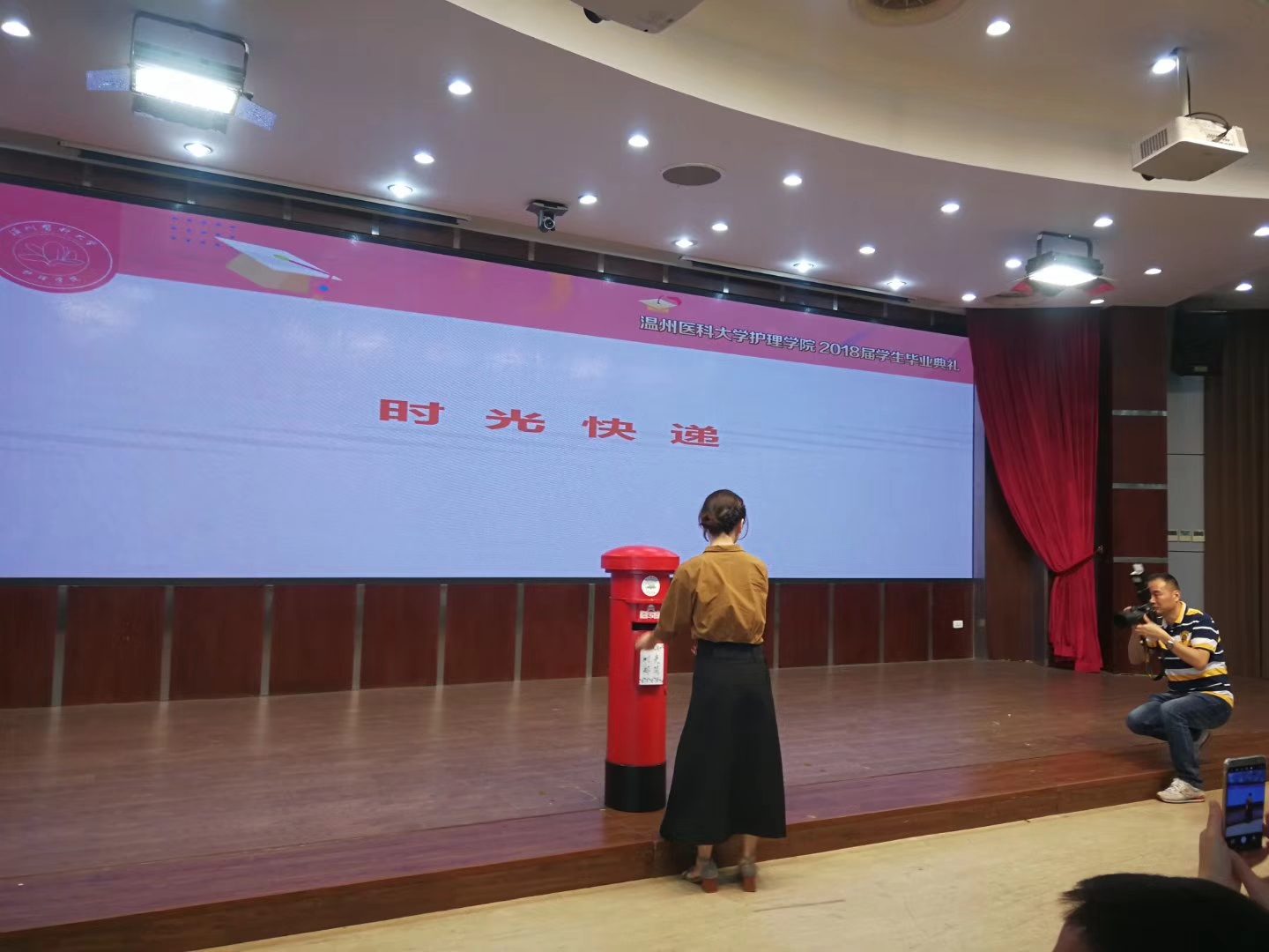 与场外的“时光隧道”相对应,今年的毕业典礼上特设“时光邮筒”环节,由毕业生们投递出给2018级学弟学妹的一封信,欢迎他们来到学院开启自己的大学生活,也为他们送上最诚挚的祝福。“我仿佛在对话多年前的自己,希望学弟学妹们看到我们的信能够有所收获和感动。”14级护本8班的潘同学说。