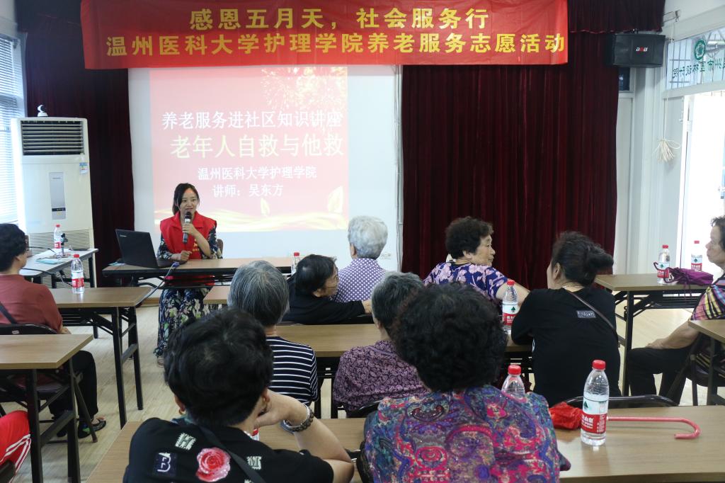 授牌仪式后,浙江省红十字应急救护二级讲师吴东方为在场的社区老年人们作主题为“老年疾病的自救与他救知识”的专题讲座。她以诙谐易懂的话语介绍了老年人的高发病并提出了建议与解决方法。