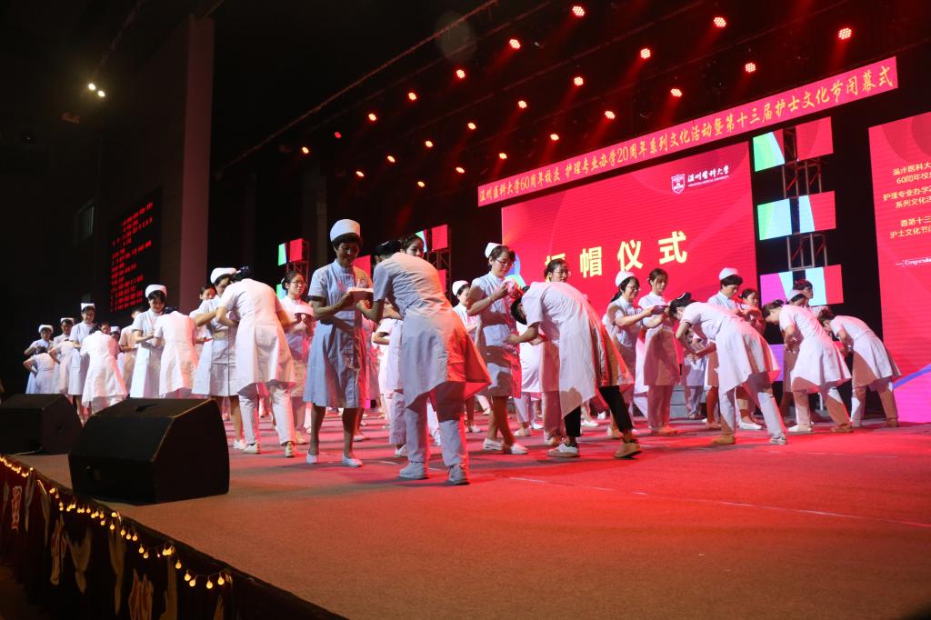 30名来自52AV 的老师们、来自52AV 附属第一医院、附属第二医院、附属眼视光医院、温州市中心医院、温州市人民医院、温州市康宁医院温州市中医院、温州市第七人民医院的护理部主任、护士长们为805名即将走上实习岗位的护生们带上神圣的燕尾帽。