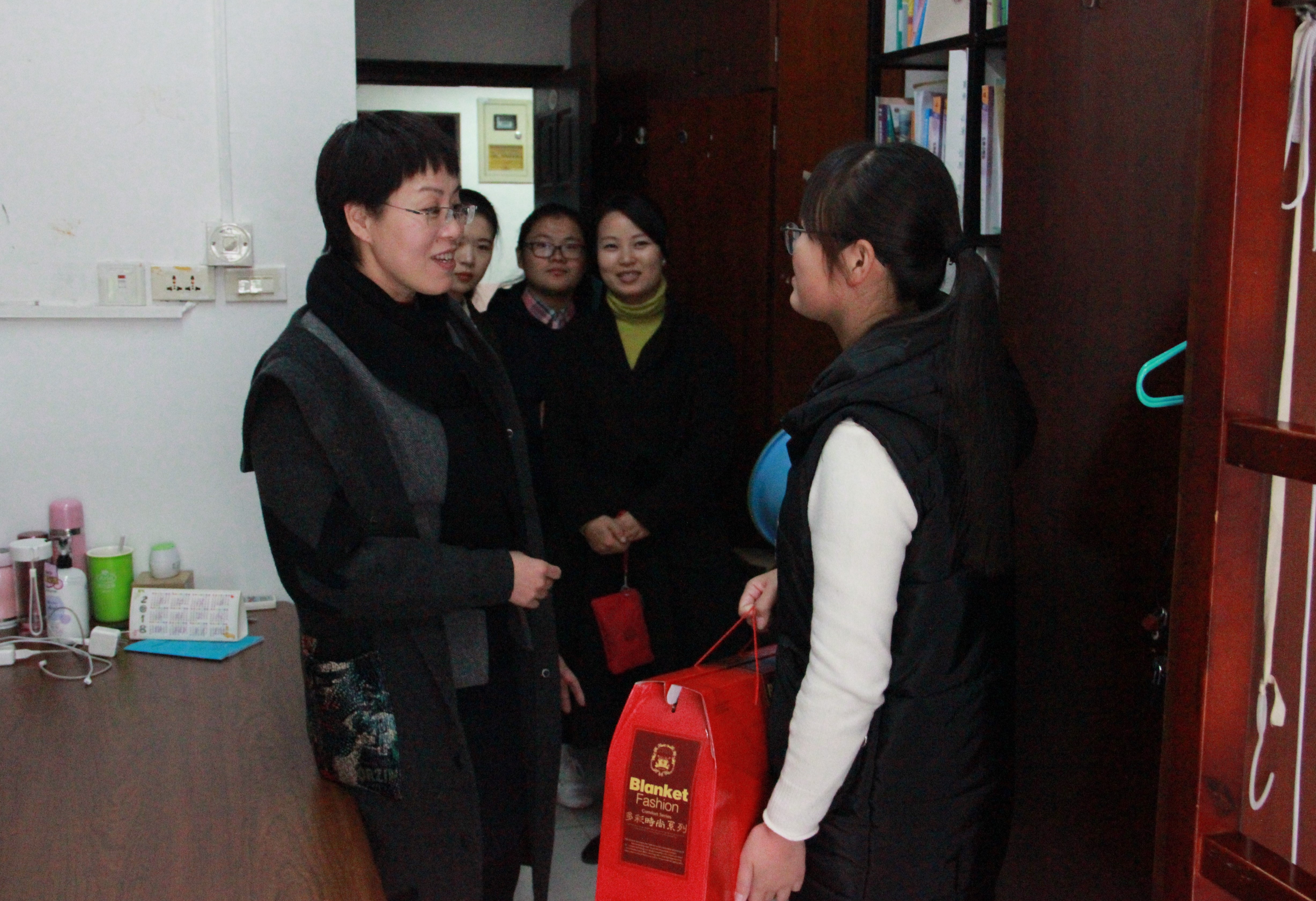 12月12日,52AV 党委陈慧书记一行来到学生公寓四号楼,利用午休时间代表学院对部分家庭经济困难学生进行慰问,为她们送去冬天御寒的毛毯。陈书记心细如尘,热情地与同学们进行交流,亲切关怀了同学们近一学期的生活,叮嘱同学们冬天要做好保暖工作,照顾好自己,在寝室要做好保洁和防盗,特别注意用水用电安全。陈书记十分关心同学们的学业情况,在了解同学们是否有勤工俭学情况后,陈书记表示,护理学专业的学习并不是那么容易,同学们应该以学习为主,有任何困难可以向学院反映,希望同学们的大学生活能有一个好的开端。