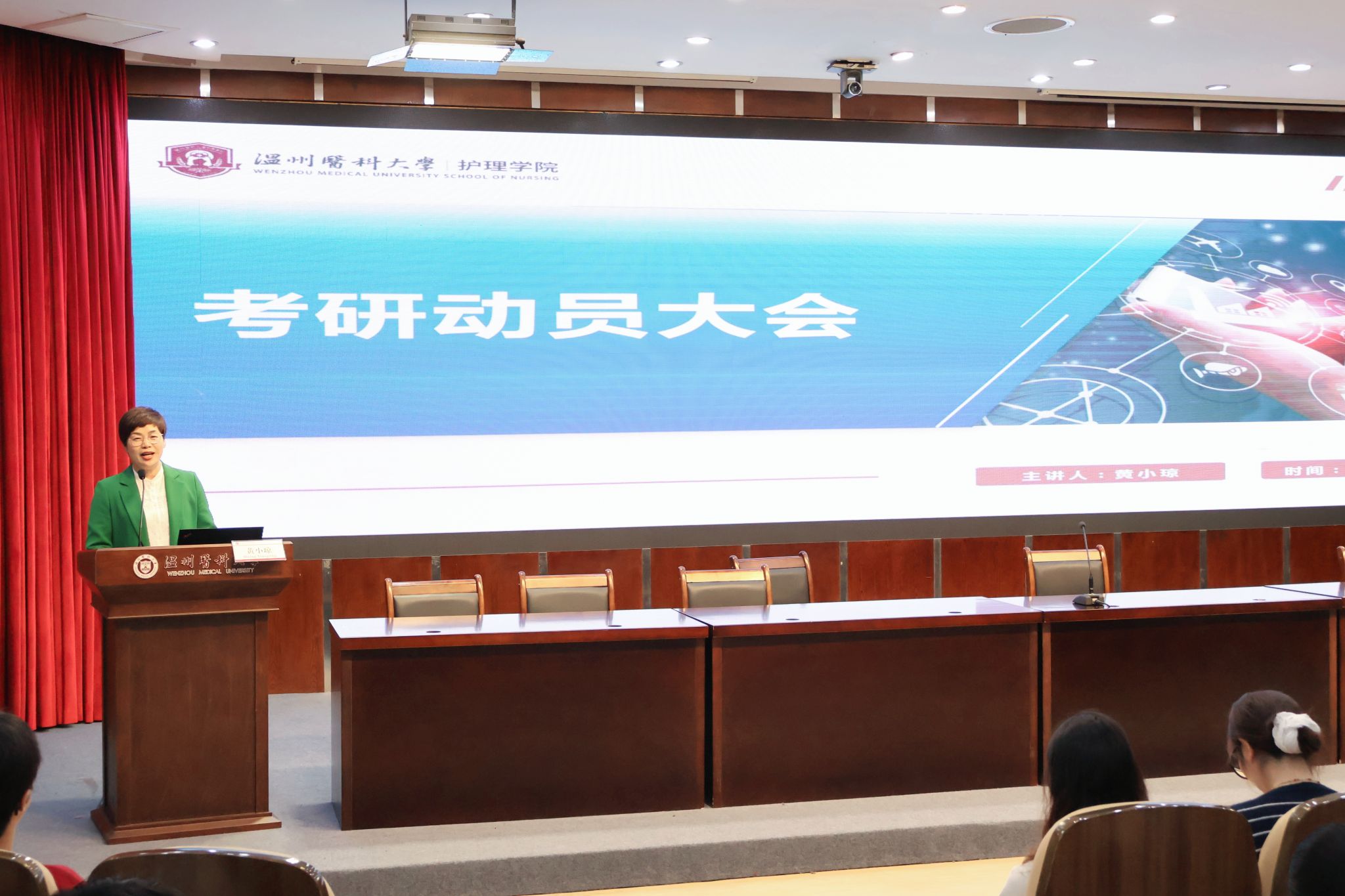 分享会上,黄小琼副院长以详实的数据为切入点,系统介绍了52AV 历年升研人数、录取院校分布以及各院校录取人数等,让同学们对本院的考研形势有了更清晰的认识。随后,黄院长对当前就业形势进行深入剖析,详细解读了全国研究生报名人数与涨幅情况、全国护士总数、医院对高层次护理人才的用人需求与学生未来自我职业发展路径规划等,激发同学们考研动力,还指出在竞争激烈的就业市场中,考研成为许多同学提升自身竞争力、拓宽就业渠道的重要选择,激励同学们把握机遇,积极备考。