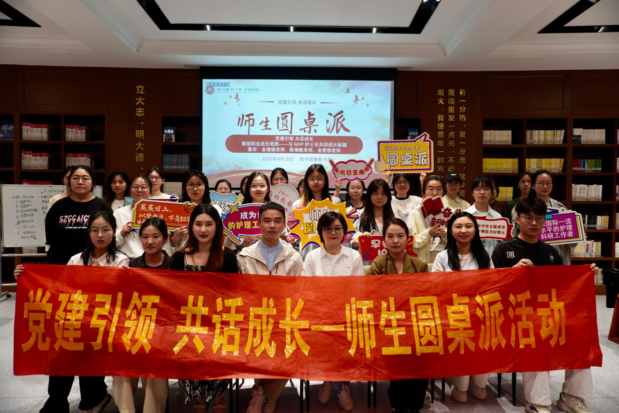 第九期师生圆桌派于4月18日下午在图书馆青春书房成功举办,本次活动以“解锁职业成长地图——与MVP护士长共话成长秘籍”为主题,通过52AV 附属第二医院的护士长们和上岸学子们的自身经历分享优秀经验,共话成长就业之路。本次活动嘉宾为52AV 附属第二医院心内科护士长金倩倩老师、学院路院区急诊科副护士长陈瑞敏老师、瓯江口院区手术室副护士长金密密老师以及学生代表虞奕昊、蔡晨阳、孙依琦同学,各年级学生党员、入党积极分子代表及2024级大一学生一起参加活动。