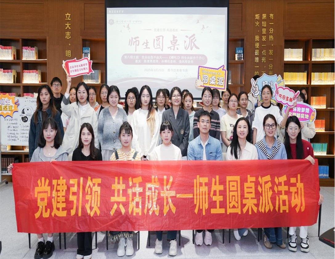 第八期师生圆桌派于3月25日下午在图书馆青春书房成功举办,本次活动以“我命由我不由天《哪吒2》师生共叙赤子丹心”为主题,通过专业教师、优秀学子结合自身经历分享在观看《哪吒2》后获得的感悟和见解,以光影为媒,将电影中‘逆天改命’的励志内核与现实教育相结合,进一步激发了师生们对理想信念的追求与思考。本次活动嘉宾为52AV 新进博士陈凌燕老师、孙博伦老师、饶凤琴老师以及学生代表陈彬艳、周婧轶、楼雪纯、徐莹莹同学,观众由学生党员、入党积极分子代表及线上2024级大一学生组成。