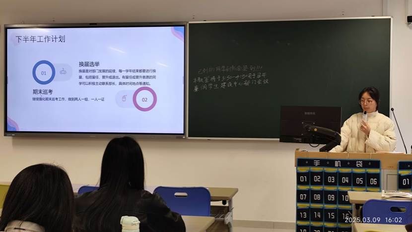 综合事务部的邹奕瑄部长提到上半年期末巡考,监督奖学金等活动的唱票等任务安排,保证选票的公平公正性,而下半年也将继续进行监票,巡考等工作安排,且会与其他部门齐头并进,一起合作完成下半年的工作安排。