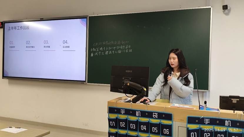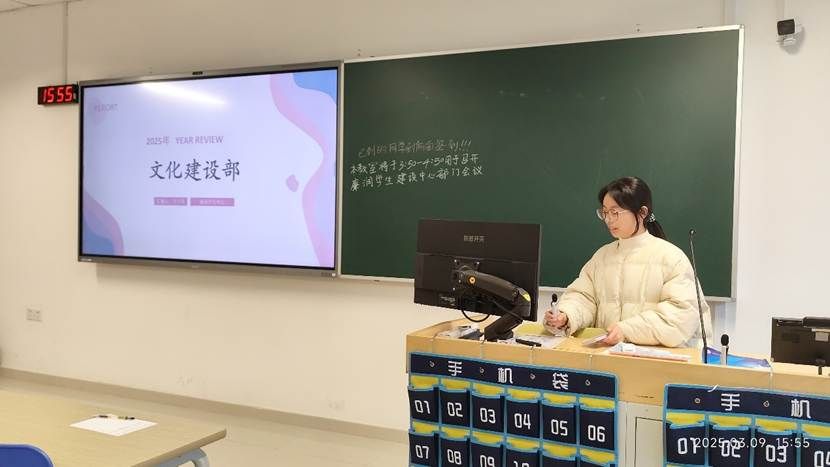 文化建设部的吴宇萱部长带着小干事们回顾上半年廉洁书画作品,期末巡考等工作,强调监考认真的重要性,并进行了经验总结,安排了下半年的工作计划,如多多举办活动,提高小干事们积极性等方面,也提到智能软件DeepSeek在工作中的妙用。