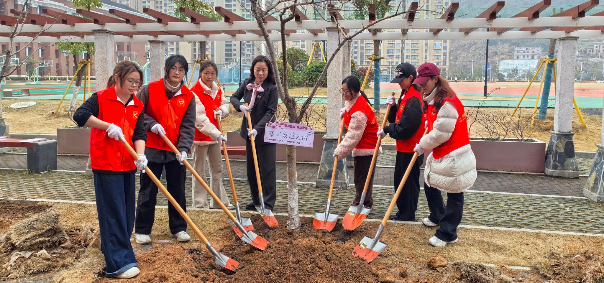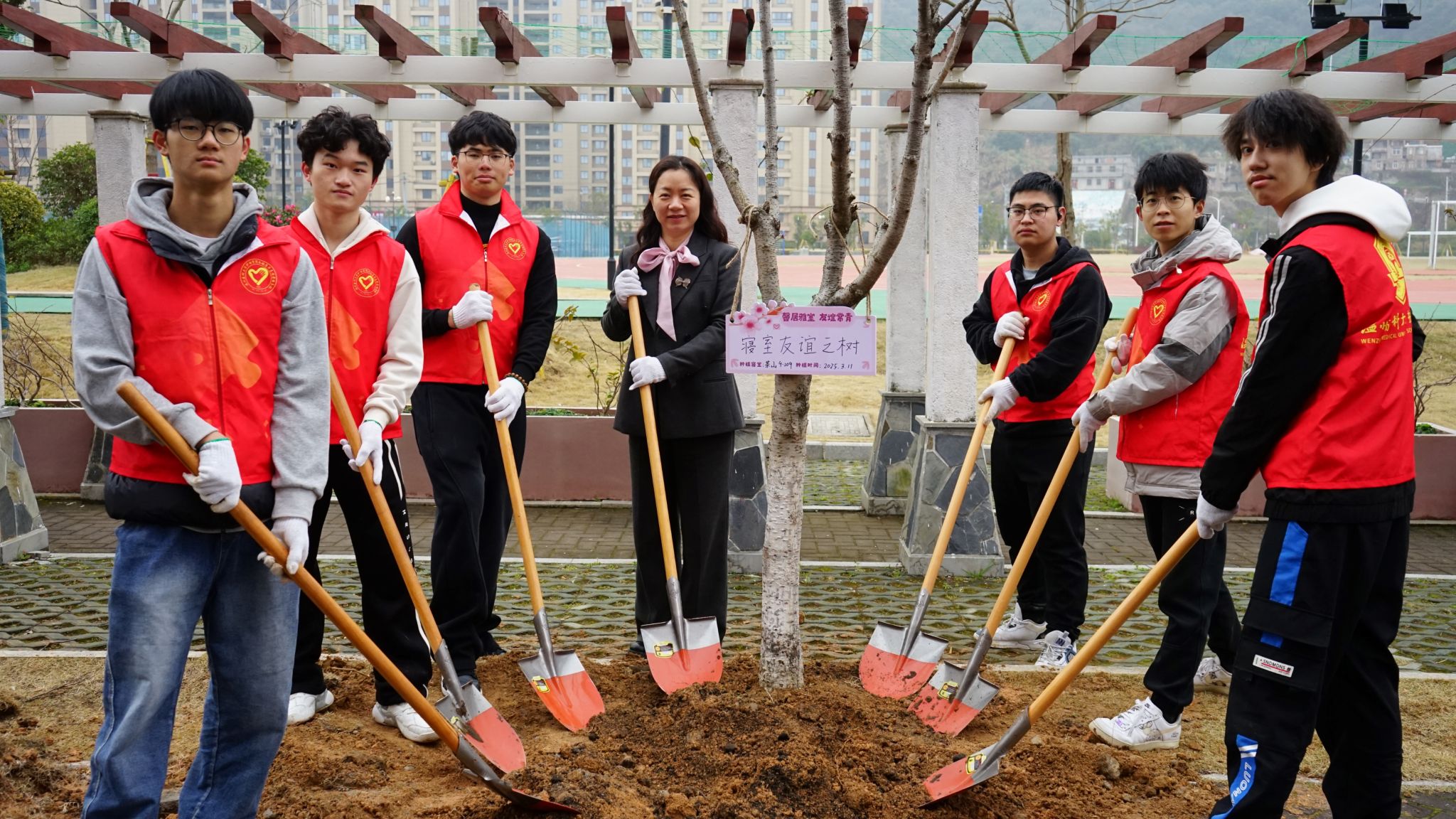 活动还将劳动实践与寝室文化建设深度融合,特别设置“寝室友谊之树”种植区。同学们以寝室为单位,在挂有“馨居雅室 友谊常青”樱花树苗前,执笔书写寝室号牌、共绘成长愿景。10棵寝室友谊之树配套的地插上写着,“三生有幸同窗谊,四载共育此树荫”,6033寝室学生代表动情表示:“这棵树是我们‘第二个家’的象征,它的茁壮成长将见证我们6033寝室共同的青春记忆。”