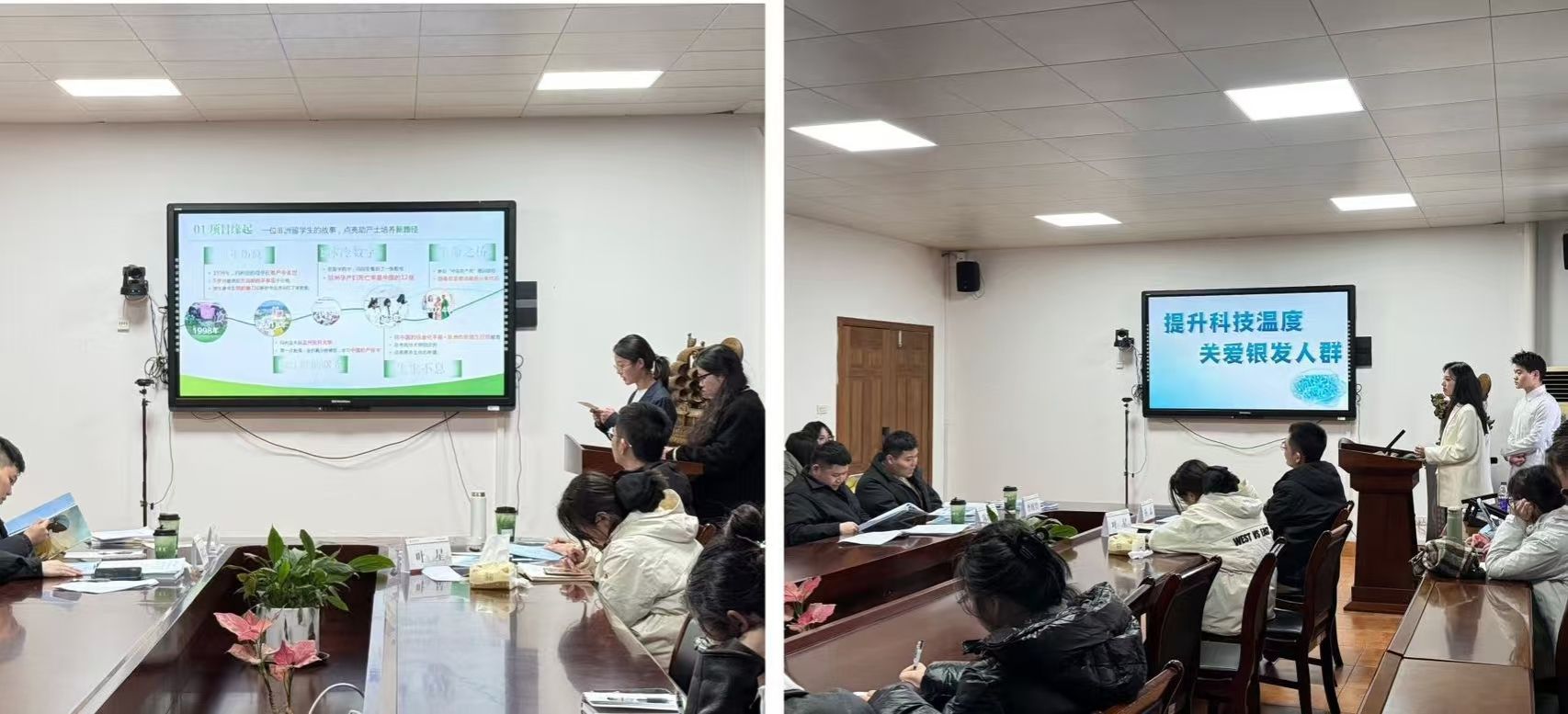 本次交流赛采用"5分钟PPT展示+现场答辩"的模式,各参赛团队围绕技术创新、服务模式优化等主题进行成果汇报。在交流环节中,各位老师从学术严谨性、实践应用性等维度给予专业指导,通过问答交流进一步深化了作品的完善方向。