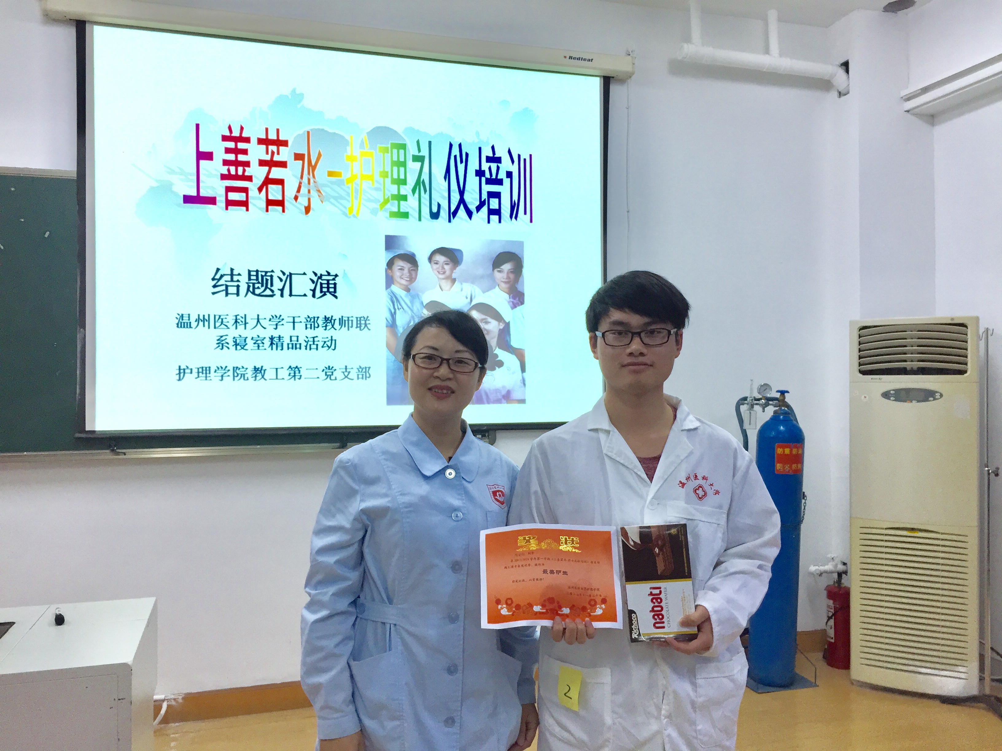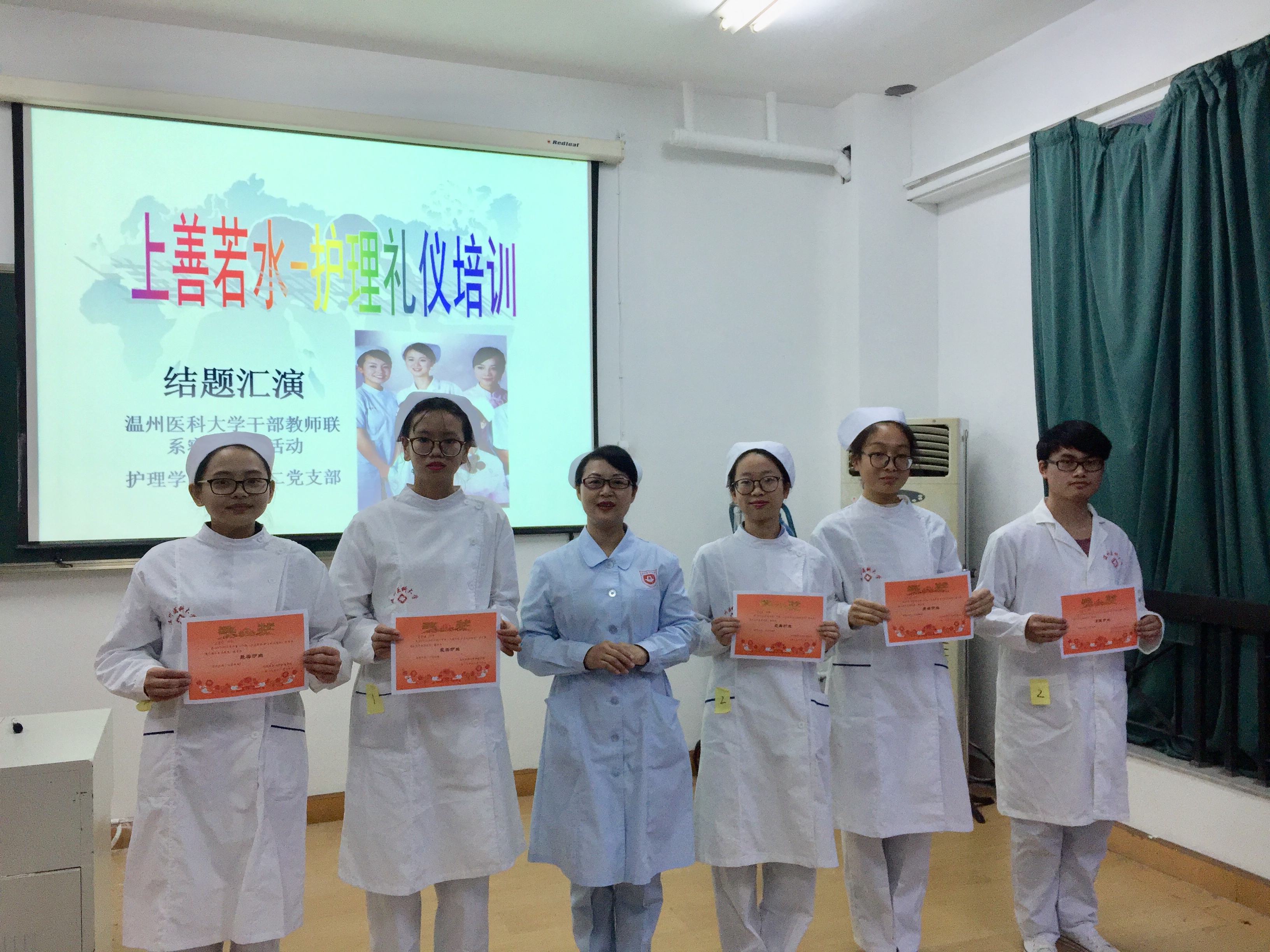 2017年11月20日,52AV 教职工第二党支部党员教师集体观看了由16届护理本科3班全体护生展示的52AV 干部教师联系寝室精品活动:上善若水——护理礼仪培训的结题汇报演出。16护本3班共6队护生结合护理工作实际特点对仪容礼仪、电话礼仪、礼节礼仪以及礼仪在日常生活、工作中的正确应用等方面做了详细的汇演,向党员教师展示了护士“礼仪”的端庄、优雅魅力。汇演结束后,沈丽娜等6名护生获得“最美护生”荣誉,扬礼队获得“最美团队”称号。