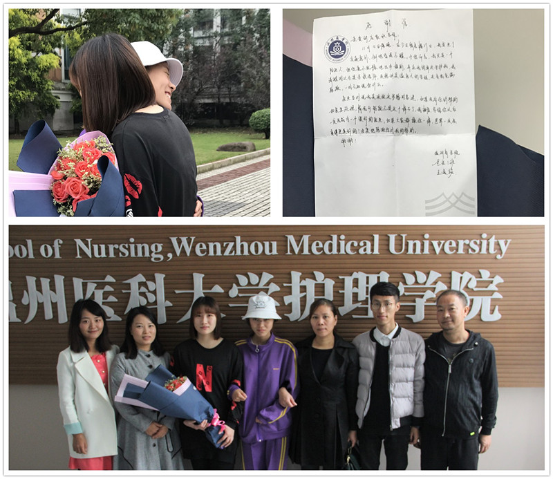11月14日,校园里,一位头缠纱布怀抱大束鲜花的女生快步跑向另外一位女生并紧紧相拥,这一温情时刻让很多人驻足观看。受伤女生正是感谢信的撰写者、温州商学院大一新生王逸铭。11月12日晚,王逸铭骑着电动车为避让骑着小黄车的学生紧急刹车,因控制不力,人车均摔倒在地,出现后脑勺出血、抽搐、失去意识等症状,现场的人都懵了不知所措,此时,人群中的一名女生走上前去呼叫她,同时紧急拨打120,镇定指挥周围同学把电动车扶起来并指挥行人车辆绕行,直到救护车到达现场,陪同受伤者一起到医院,检查观察,无碍之后才离开。在王逸铭师长询问其姓名等信息的时候,她说,“这是每一个温医大的同学看到都会做的,人没事就好,不必言谢。”就离开了。后来,他们多方打听,这名白衣天使就是52AV 在读学生应家欣同学,于是来校表示感谢。王逸铭及其师长均表示能够在紧急关头伸出援手予以正确的处理,是一种正能量,必须要感谢。