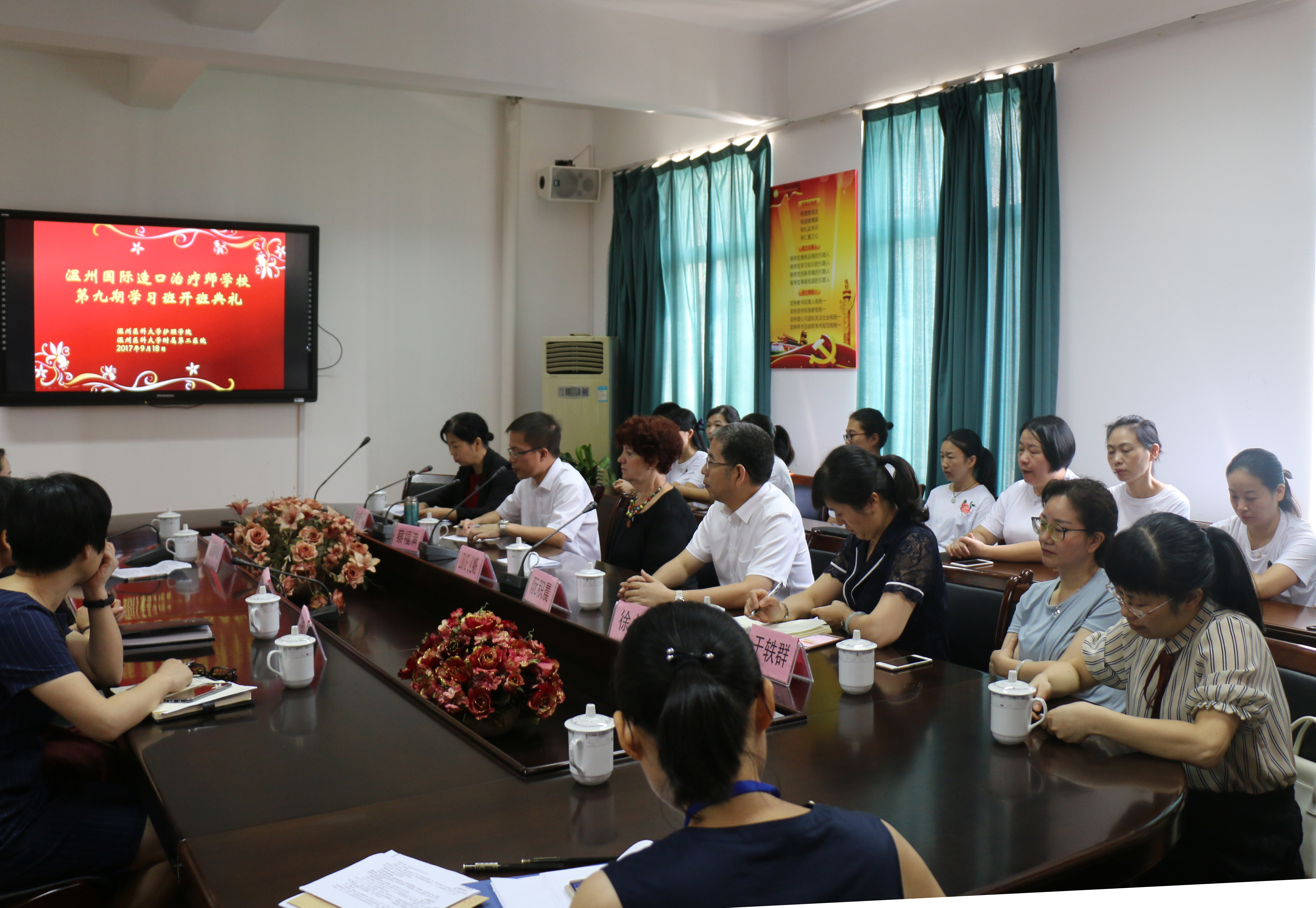 9月18日上午,温州国际造口治疗师学校第九期学习班开班典礼在52AV 会议室举行,世界造口治疗师协会前主席路易丝女士,52AV 副院长蔡福满,附属第二医院副院长阮积晨,温州国际造口治疗师学校副校长陈爱华,及附属第一医院、附属第二医院护理部主任,授课