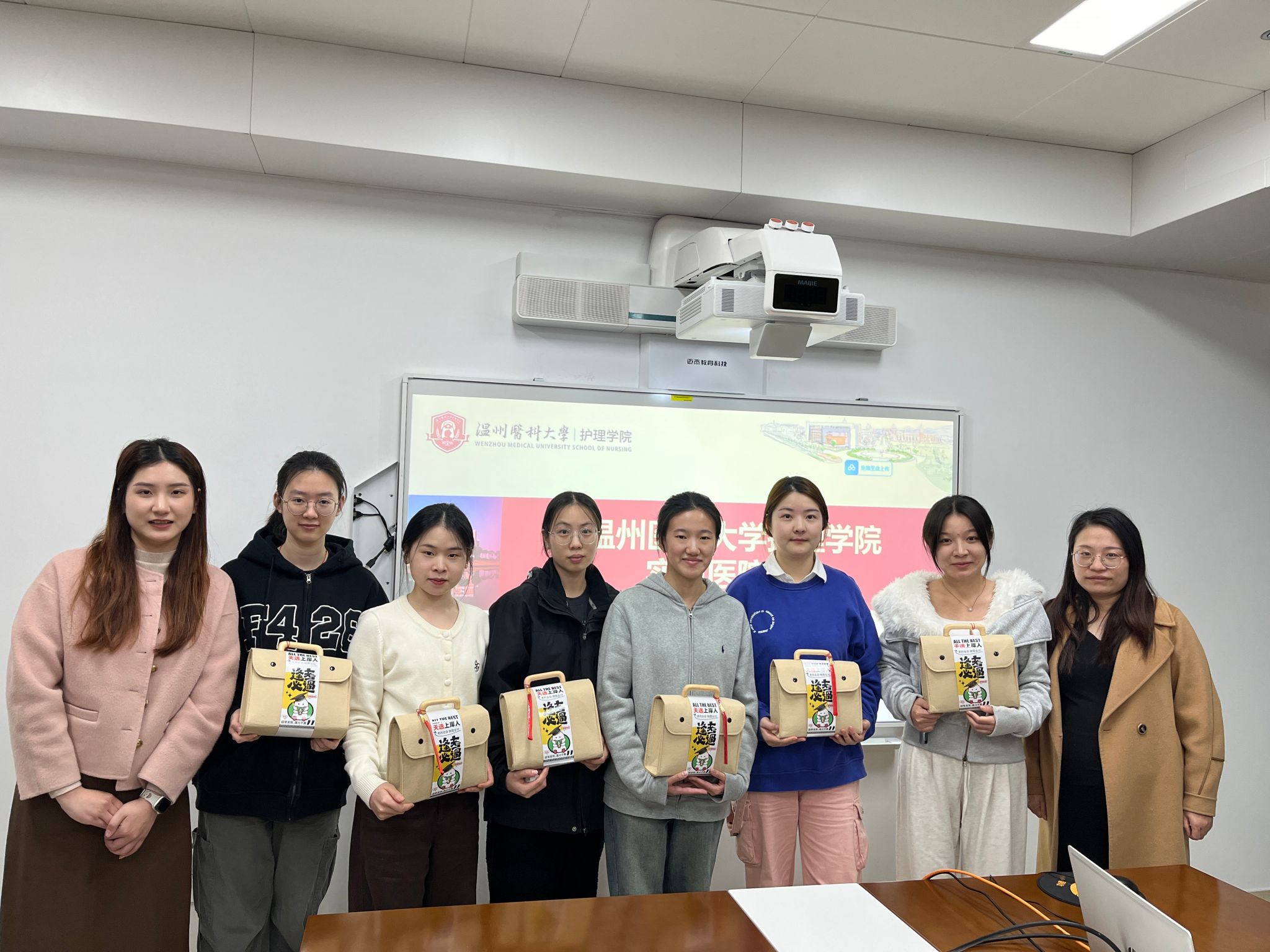 在考研冲刺的关键阶段,为深入了解52AV 考研学子的备考情况,送上学院的温暖关怀。近日,52AV 2025届辅导员张迪、李飞跃和张颖走访了温州市区实习点,为实习期间努力备考的同学们送去了精心准备的考研大礼包,每一件礼品都蕴含着美好寓意。象征着“一举夺魁”的针织葵花,愿同学们在考研的战场上勇夺佳绩。象征着“青松上岸”的手机支架,希望能够缓解同学们备考时的疲惫,保持最佳状态。同时,贺卡上写满了考研祝福语,愿同学们在考研的路上,每一步都坚定而有力...