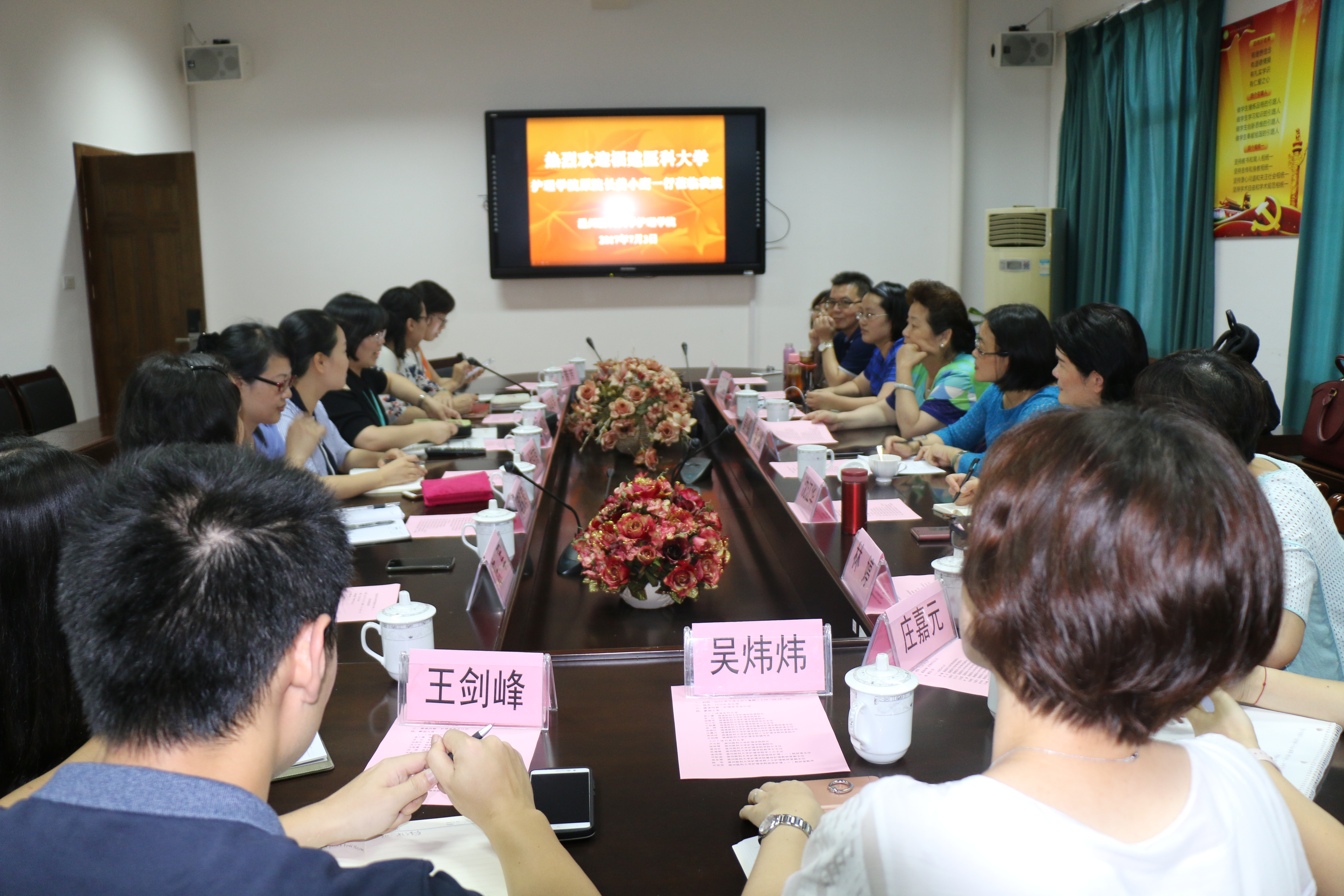 7月3日,福建医科大学52AV 原院长姜小鹰、院长李红一行16人来访52AV 。院长卢中秋、党委书记陈慧、副院长蔡福满、杨晔琴等热情接待了来访客人。