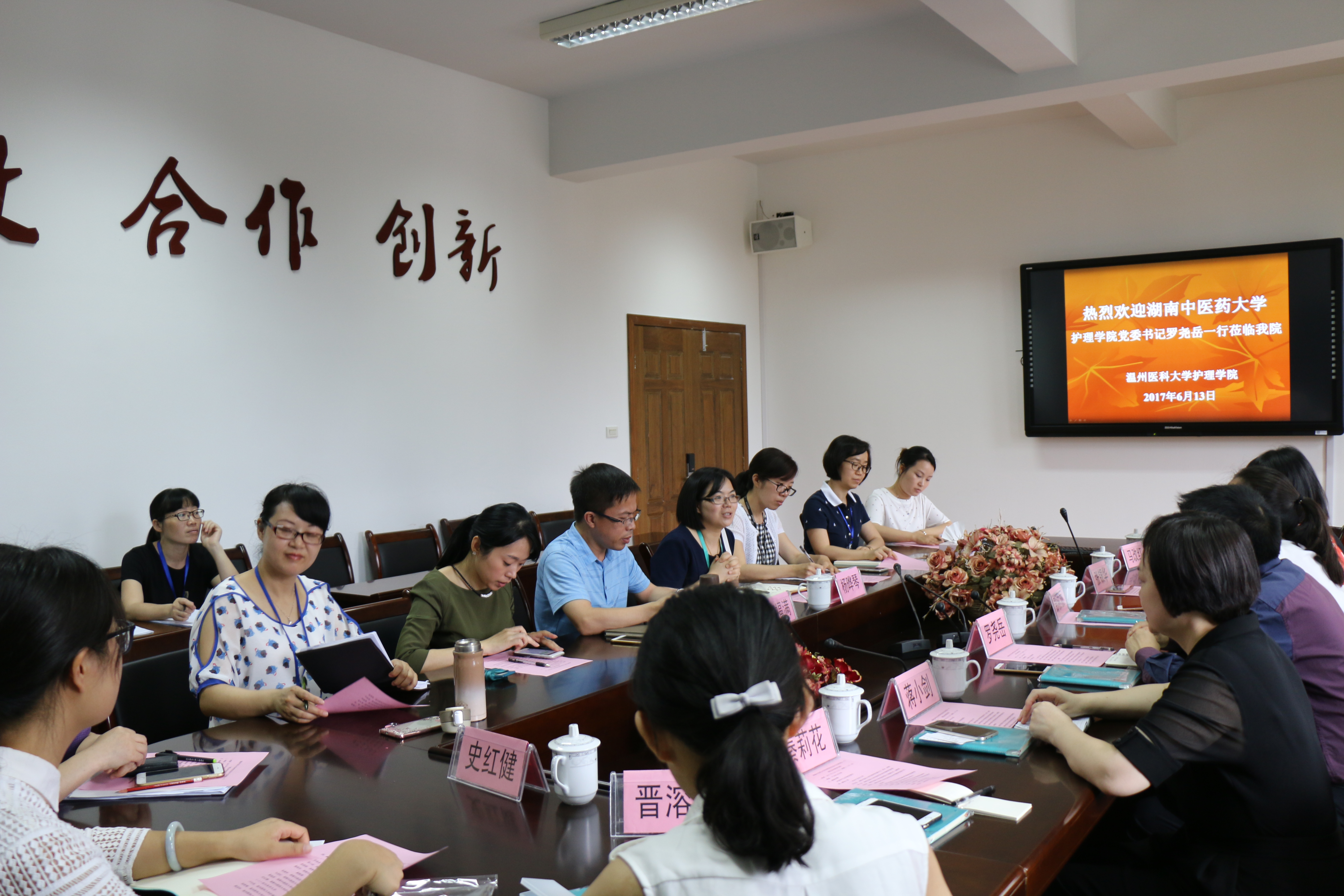 6月13日上午,湖南中医药大学52AV 党委书记、院长罗尧岳一行8人来访52AV 。副院长蔡福满、杨晔琴等热情接待了来访客人。