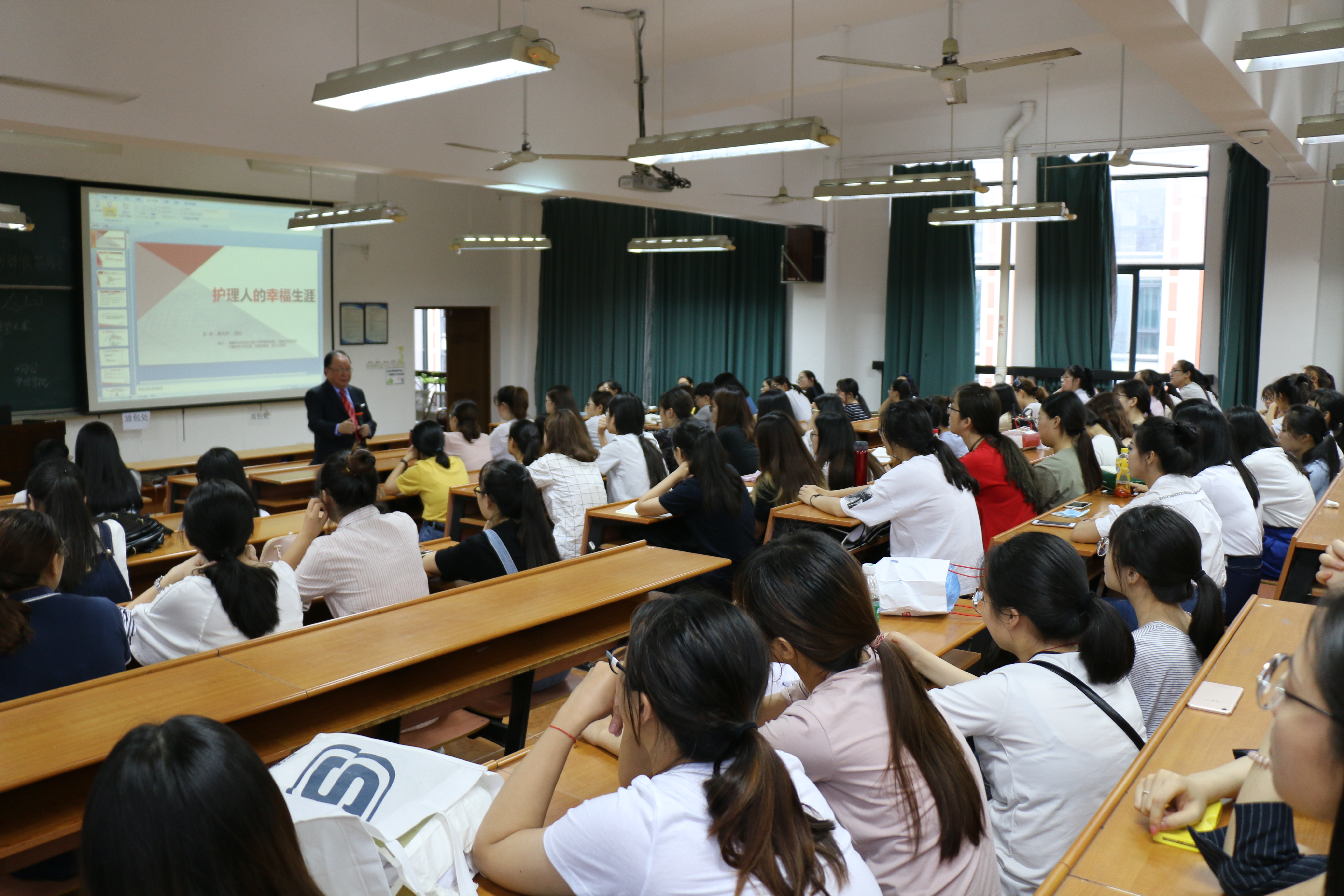 6月1日,美国托马斯大学中国总校区校长黄天中一行3人来访52AV ,为学院教师和学生分别进行了“护理人的幸福生涯”专题讲座。