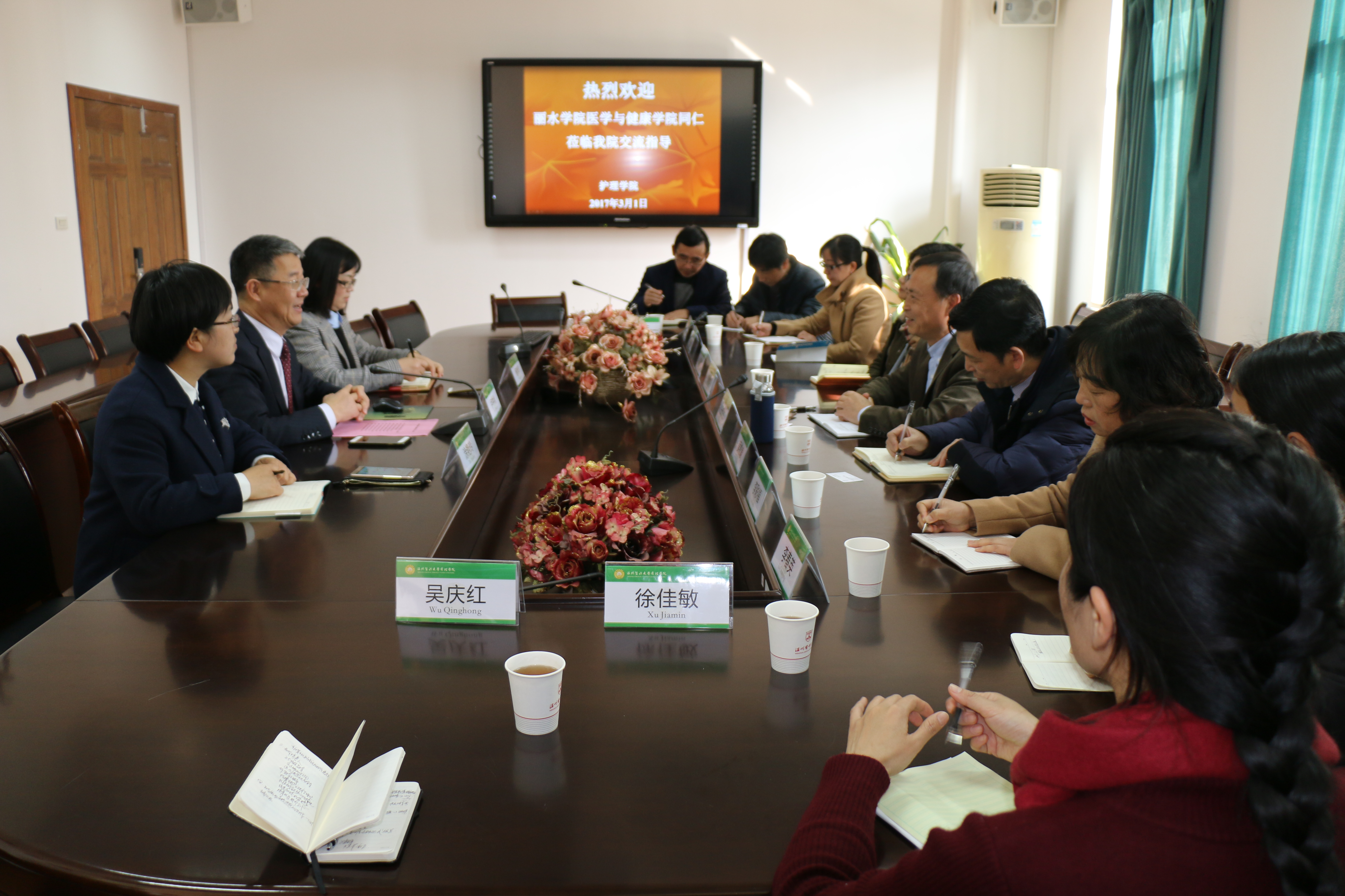 3月1日,丽水学院医学与健康学院党委书记、常务副院长王伟杰,副院长吴松泉等一行11人来访52AV 。52AV 院长卢中秋、副院长杨晔琴、党委副书记涂艳玲等热情接待了来访客人。
