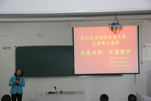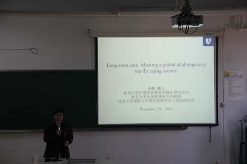 12月23日,由52AV 社科联主办、52AV 承办的“迎接国家社科基金申报系列动员活动”之一在52AV 7C302教室举行。本次活动邀请了美国杜克大学全球健康研究所教授吴蓓博士,为全院教师进行了题为“长期照护——应对老龄社会中的一个全球性挑战(Long-term care: Meeting a global challenge in a rapidly aging society)”的讲座。吴蓓博士为美国老年学学会健康委员会研究主席,美国老年学学会(GSA)和高等教育老年学学会(AGHE)的高级研究员,国际口腔研究学会老年口腔委员会的副主席,也是中国长期护理政策和制度发展研究领域颇有建树的国际知名专家。她根据自己长期以来的研究经历向我们介绍了长期照护在当今全球老龄化社会背景下的必要性。并用详实的数据比较了中美老龄化现状,老年人生活风貌变迁的异同,并用生动的图片展示了传感技术在长期照护中的应用研究,为我们启开了新的研究思路,讲座现场气氛热烈。在讨论阶段,来自52AV 、附属医院、人文社科学院的参会者提出了“老年痴呆”的更名问题、COPD的长期照护如何进行等议题,现场讨论热烈,讲座一直持续到上午十二点才结束。
