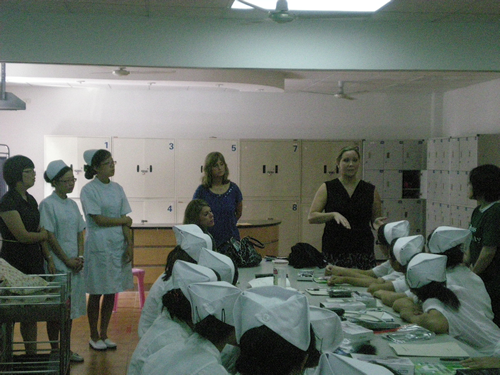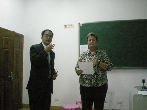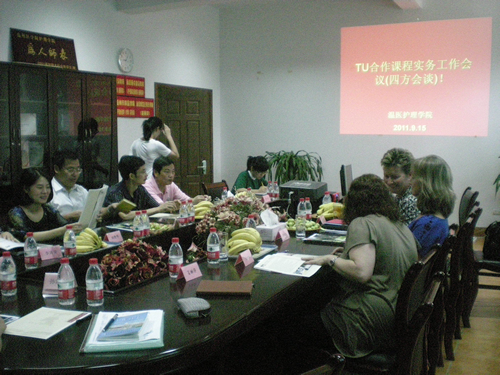 今年我校招收了首届与美国托马斯大学合作办学的护理学专业新生。在接下来的几天时间里,美国托马斯大学代表团一行与我们52AV 相关的领导和老师就今后合作如何具体实施和课程安排进一步交换了意见和建议。Susan Otto博士向中外合作班的首届学生和中方的相关负责老师介绍了托马斯大学的发展现状以及该校的护理专业并解答了同学们的相关问题。另外也向老师和同学们阐述了中外合作护理学专业学生的培养目标和方向。Shannon Woods教授向我校和江西中医学院的老师代表们介绍了护理专业在美国的学习、从业情况以及今后的发展前景,让中方老师更清楚地了解了护理学专业在中国和美国的区别和共同点,对双方今后的进一步合作有着积极的意义。Kim Cribb博士带领随行的托马斯大学的学生走进了我校护理学专业课堂,同我校学生一起进行护理课程学习的互动,体验我校护理学专业的教学特点,并与中方的学生就两校的专业课学习、专业就业现状等进行了面对面的交流。为了欢迎托马斯代表团一行的到来,我校护理专业中外班的学生精心准备了一场文艺演出。在演出会场,还举行了首届托马斯大学中美护理教育学生友好大使授证典礼。另外,为了更深入的了解我校护理专业在临床上的应用和发展现状,托马斯代表团一行来到我校附属第二医院,参观了该院的康复科室,并且和附二院的护理部张春梅副主任及相关科室护士长就中国和美国就护理工作的开展和具体实施进行了交流。
