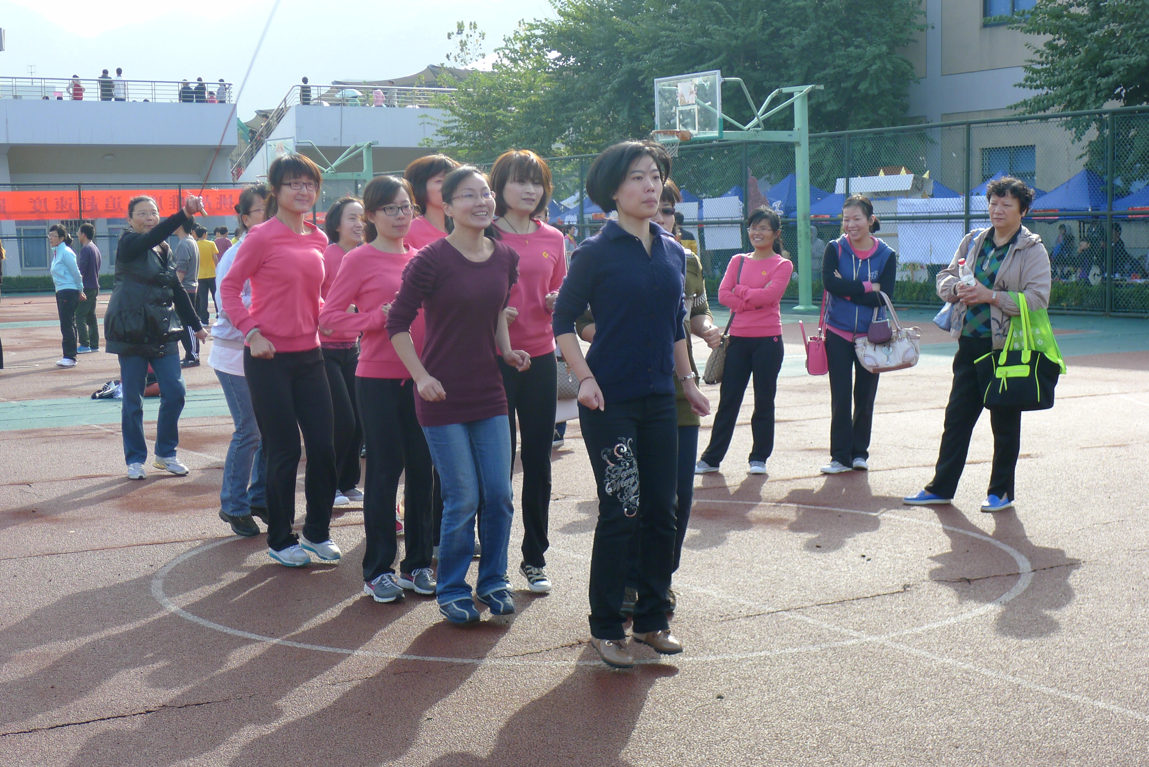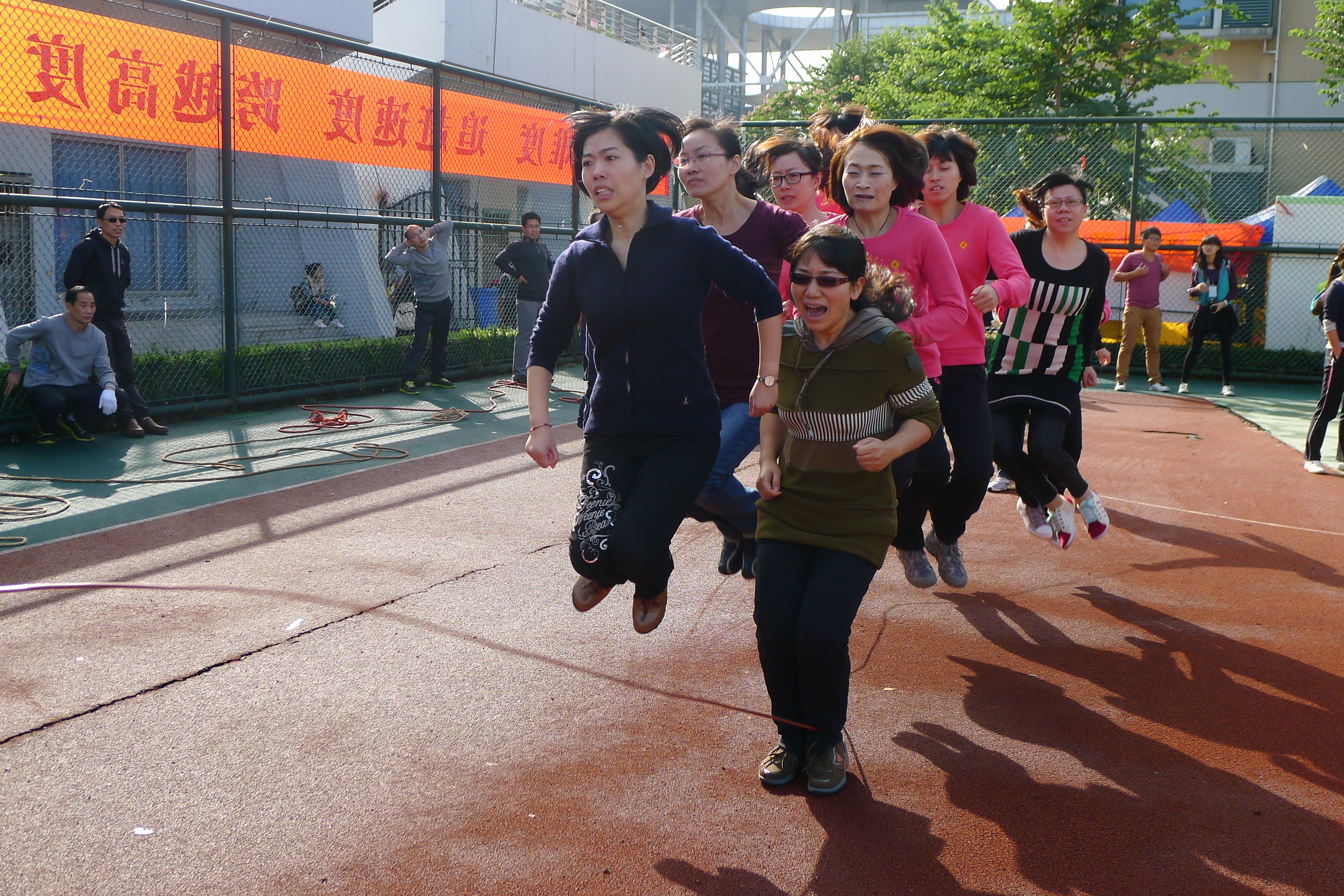 白云悠悠,秋风徐来,田径场后的篮球场上,一条条长绳不停地在舞动,52AV 的女老师化身成女将,积极备战。