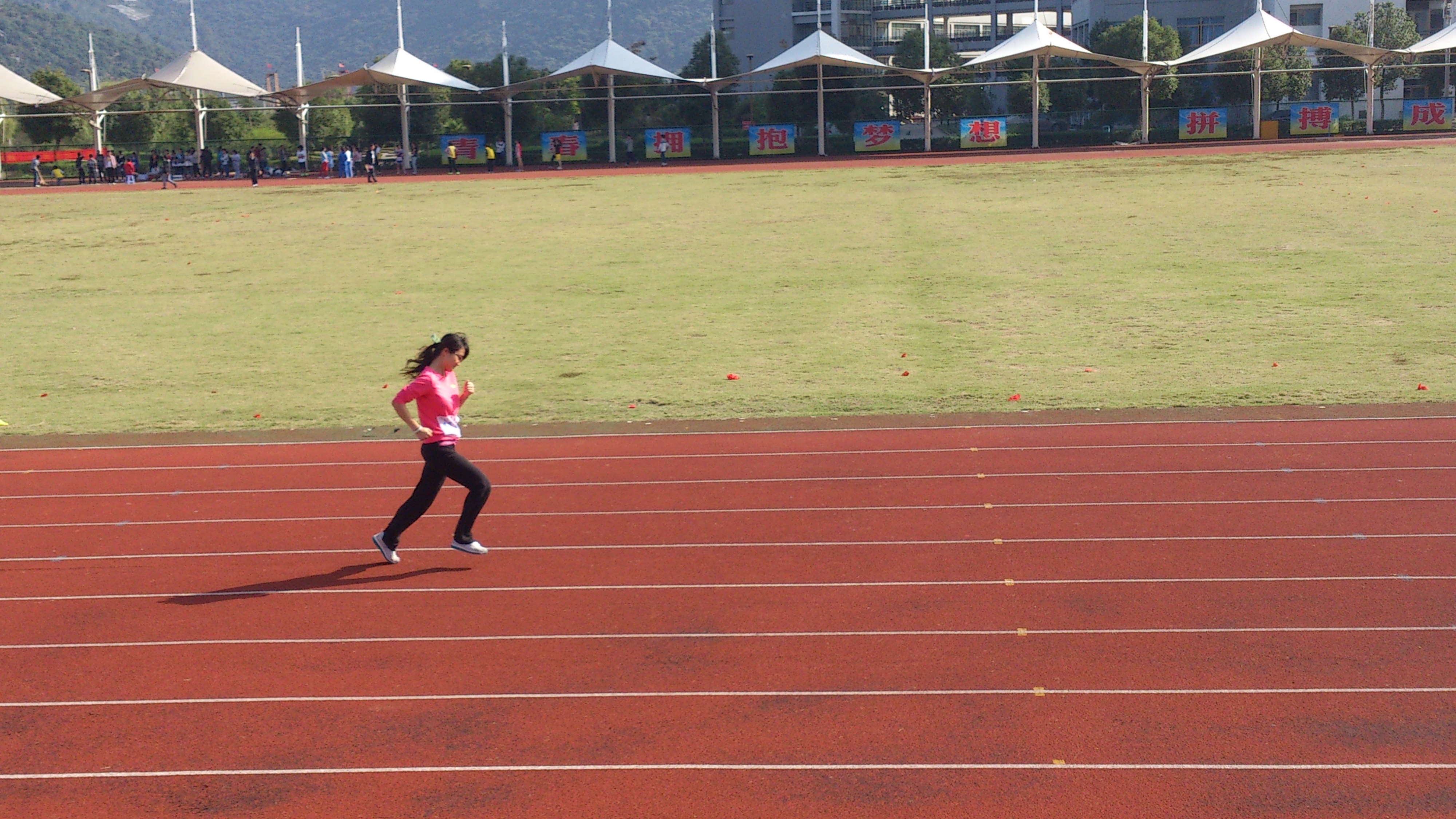教工乙组女子预赛在10:15拉开序幕。郑文文老师一身宽松运动装,英姿尽现。蹲身,双手轻触跑道,仰首,眼带坚毅,望向前方。随着一声枪响,她如离弦的箭一样奋力向前飞去,摆动手臂,扬起步伐。热烈的阳光投射在她眼里,这一刻,她仿佛看不到一切,眼里只有终点,满是坚定。