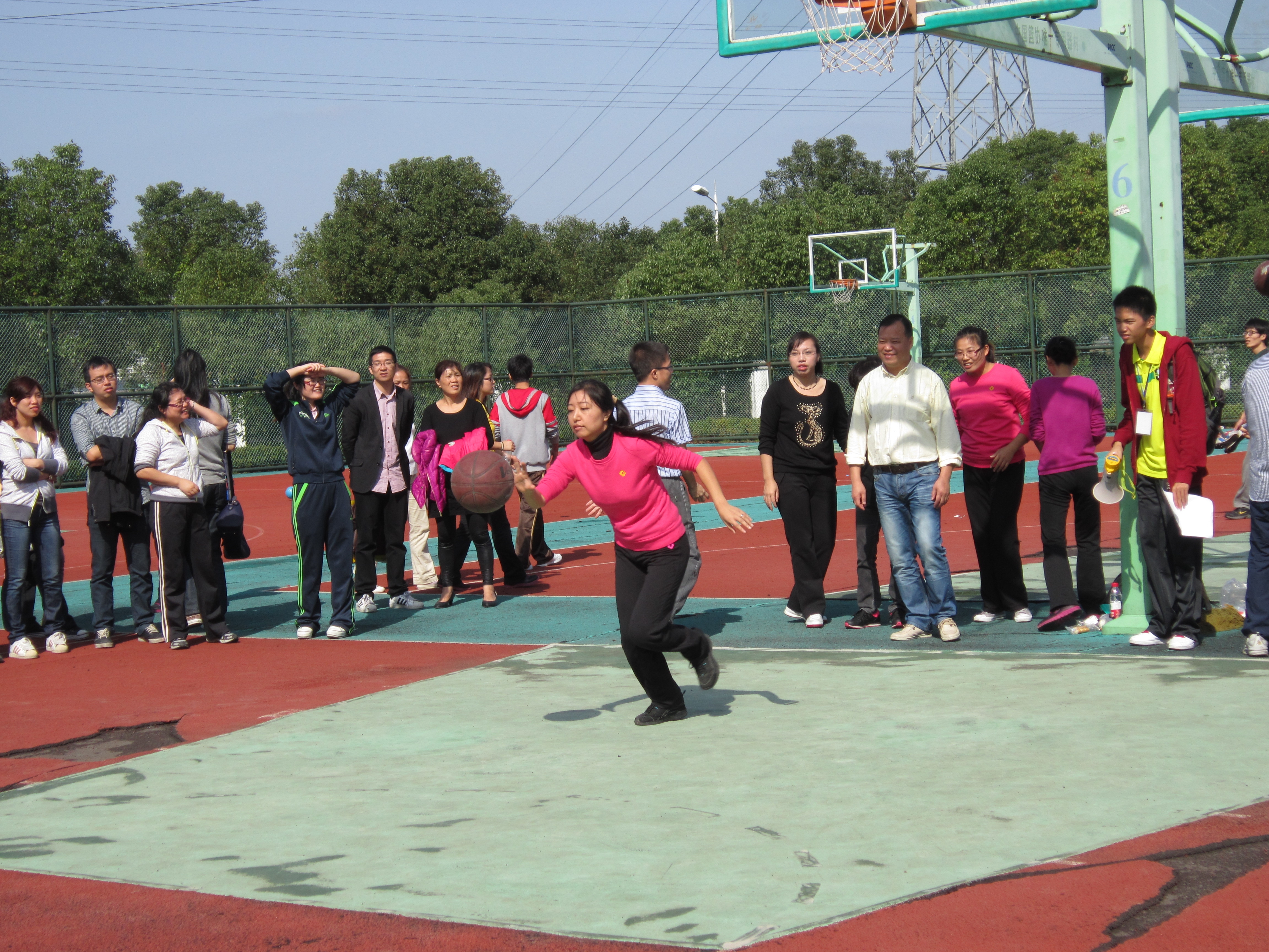 2012年11月11日上午10点,52AV 参加投篮比赛的老师们早已准备就绪,跃跃欲试。随着裁判员一声令下,参赛老师们运着球,迅速向着篮筐奔去。投篮运球比赛需要的不仅仅是个人的速度,更需要的事整个团队的合作。尽管老师们的速度不是最快的,但是他们的合作十分默契,前一位老师刚刚出发,下一位老师便立即站到起始处,紧张地等待着传球。整个过程异彩纷呈,进行得紧张而有序,每一个进球都引来阵阵掌声和欢呼。