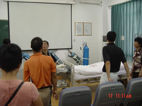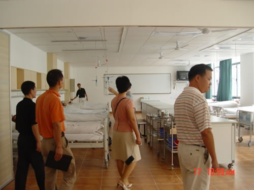 陈行汉副书记向客人们介绍了学校和学院的办学历史,护理专业的发展情况。学院办公室王世泽老师向客人们详细汇报了学院的招生就业、学科建设、人才培养、实验室建设、教学管理和实习基地建设等有关方面情况。朱卫民院长也向我们简单介绍了广西医科大学52AV 的教学、科研和人才培养情况。随后客人们参观了学院护理学基础、急救护理学、外科护理学、妇儿实验室和护理示教室,他们详细了解了实验室建设规划、布局等情况,对52AV 的实验室建设和教学管理工作大加赞赏。