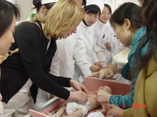 近日,美国西北大学的两位在附二医新生儿从事护理工作的志愿者,在附二护理部张春美老师和时亚平老师的带领下参观了52AV ,期间,在学院会议室,52AV 王一婷老师代表学院向两位客人介绍了学院的发展史和学院总体的情况,随后,52AV 副院长姜丽萍在百忙之中接见了两位远到而来的客人,并为志愿者颁发纪念品..最后两位洋护士还兴致勃勃地参观了52AV 试验室,并饶有兴致地参与了学生实验课,两位洋护士对温州医学院52AV 的发展规模和理念表示惊讶,同时对52AV 的先进的试验设施赞叹不已,纷纷表示希望今后有机会来52AV 做一名护理教学工作的志愿者.