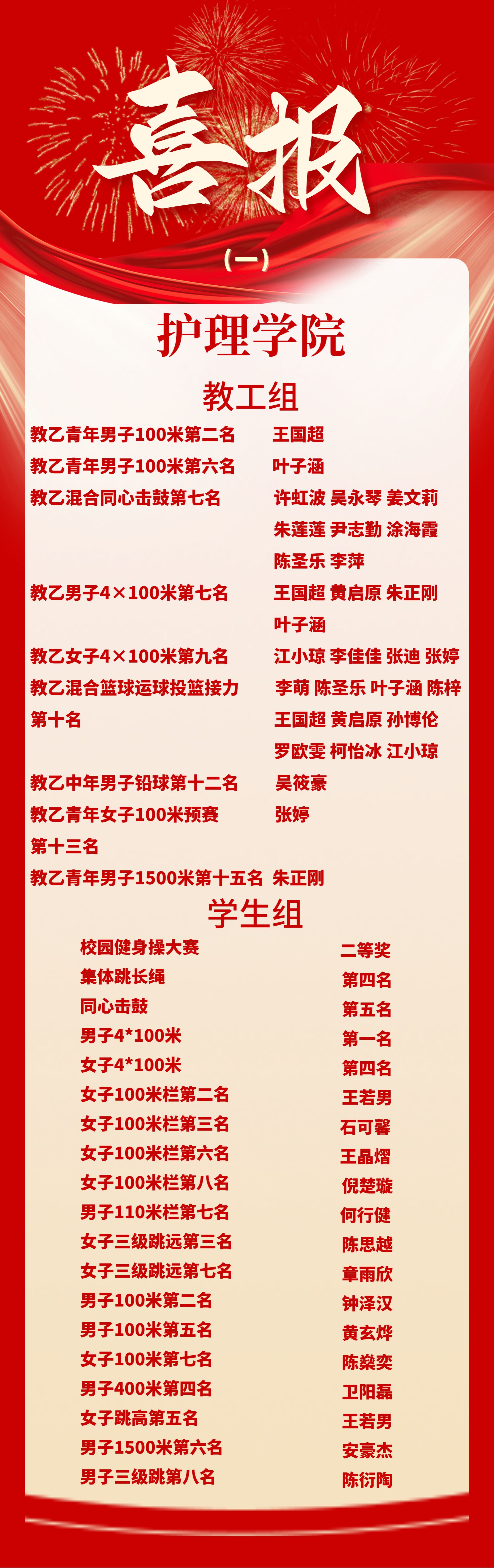 在教乙青年男子100米决赛中,52AV 王国超老师获得第2名、叶子涵老师获得第6名;在教乙青年女子100米预赛中,52AV 张婷老师获得第13名;在教乙青年男子1500米决赛中,52AV 朱正刚老师获得第15名;在教乙男子4×100米决赛中,52AV 教职工王国超、黄启原、朱正刚、叶子涵获得团体第7名;在教乙女子4×100米决赛中,52AV 教职工江小琼、李佳佳、张迪、张婷获得团体第9名。