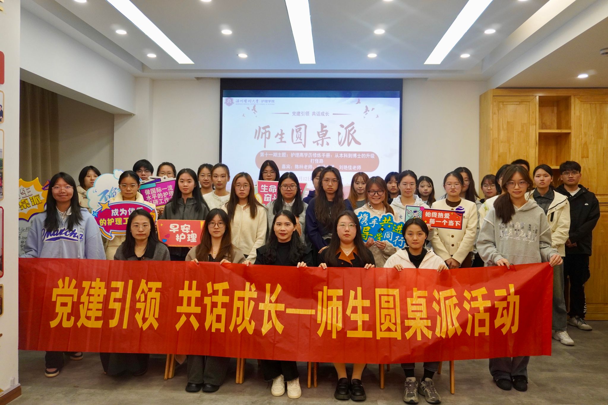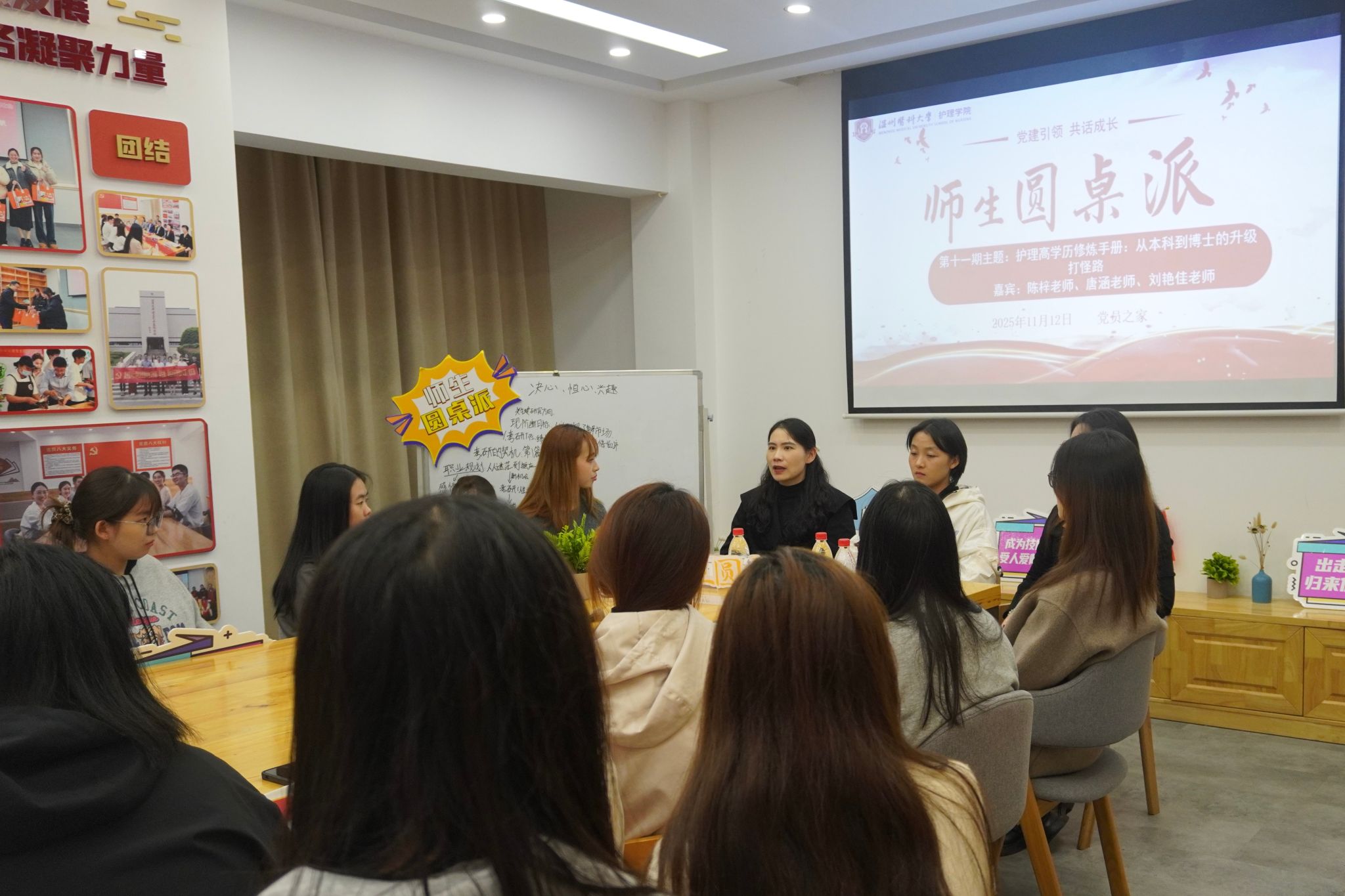 第十一期师生圆桌派于11月12日下午在党员之家成功举办,本次活动以“护理高学历修炼手册:从本科到博士的升级打怪路”为主题,通过52AV 老师们和研究生学姐分享成功秘籍,共话学习成长之路。本次活动的嘉宾为52AV 的陈梓老师、唐涵老师和刘艳佳老师以及研究生唐亿倩学姐,各年级学生党员、入党积极分子代表一起参加活动。