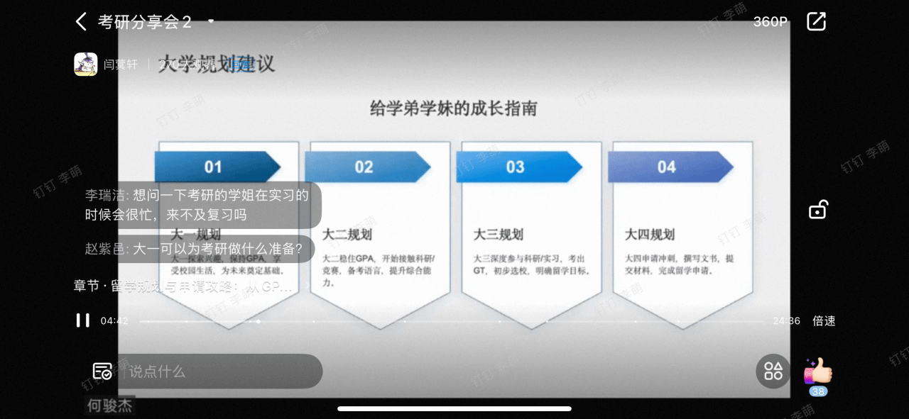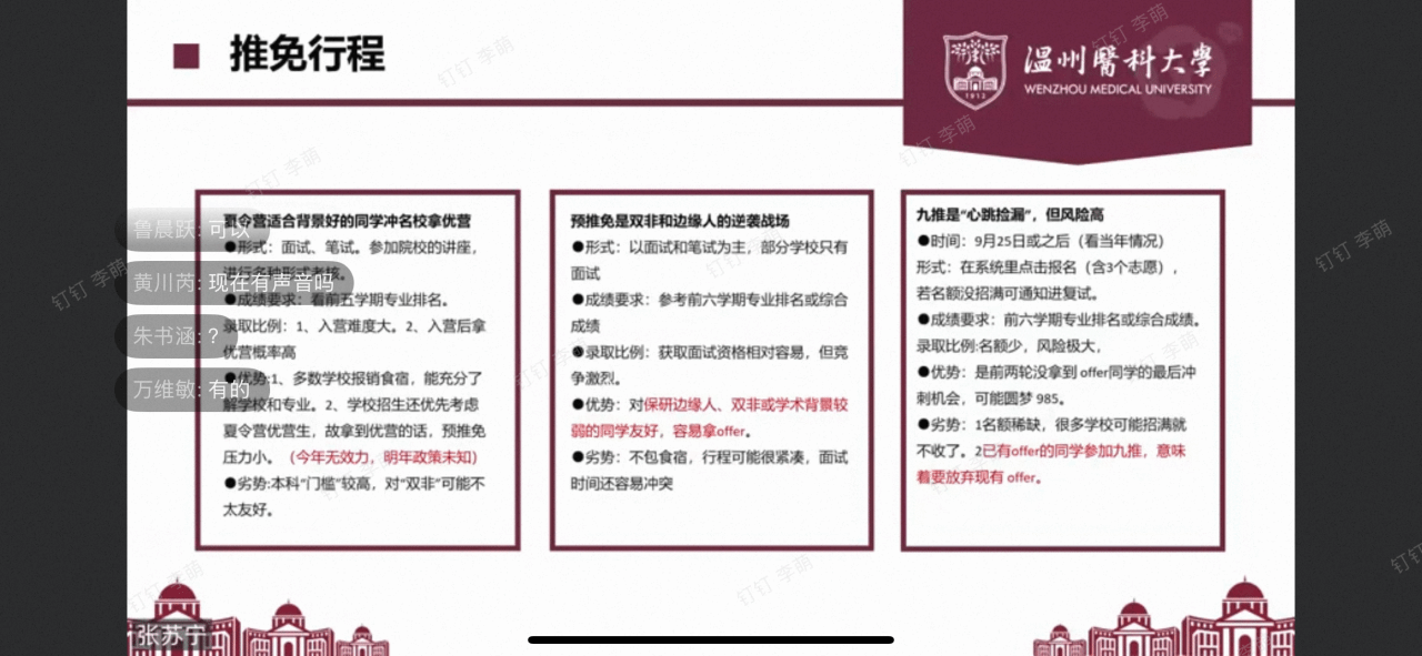 分享会上,张苏宁同学聚焦“推免全流程攻略”,从政策解读、材料准备、面试应对三大维度进行系统讲解。她结合52AV 推免政策,对比分析了历年推免名额变化,帮助同学们准确把握推免形势;同时详细列出推免材料清单并提供实用模板,分享了“院校投递”“预判面试官意图”等宝贵经验,增强了同学们对推免的了解与信心。