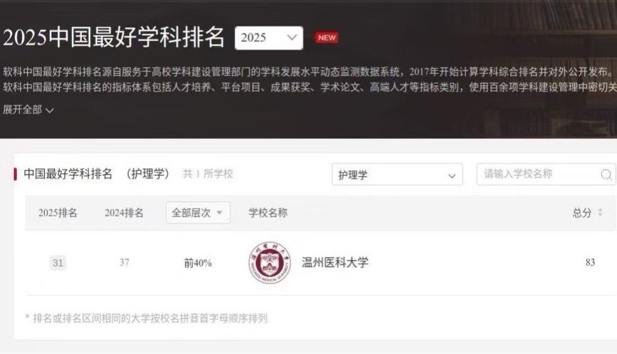 学科实力稳步攀升。在“2025软科中国最好学科排名”中,护理学以浙江省属高校第一位列全国第31位,较上年跃升6位。首次跻身“2025软科世界一流学科排名”全球201-300区间,成为浙江省属高校中该学科唯一上榜单位,学科国际影响力实现标志性突破。