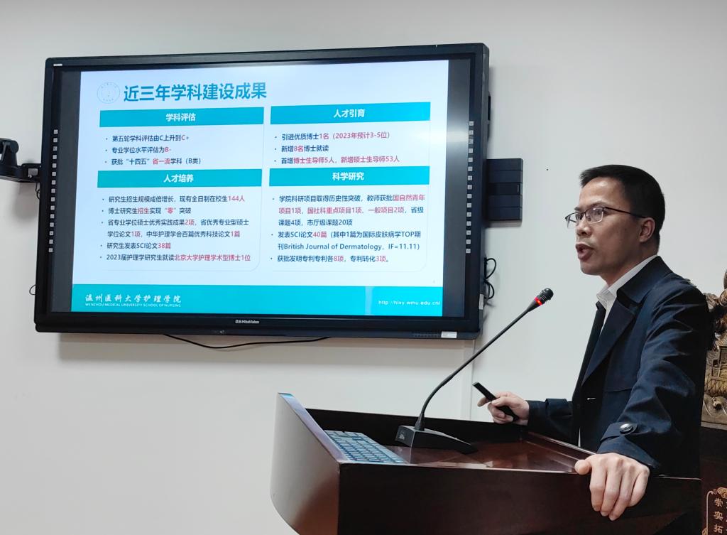 学院院长蔡福满作专题汇报,对标学校“双一流”创建目标和高水平医科大学建设任务,重点介绍了护理学学科建设情况,从近年来护理学科建设主要成果、博士点竞争态势分析、对标建设措施等方面进行了详细阐述。