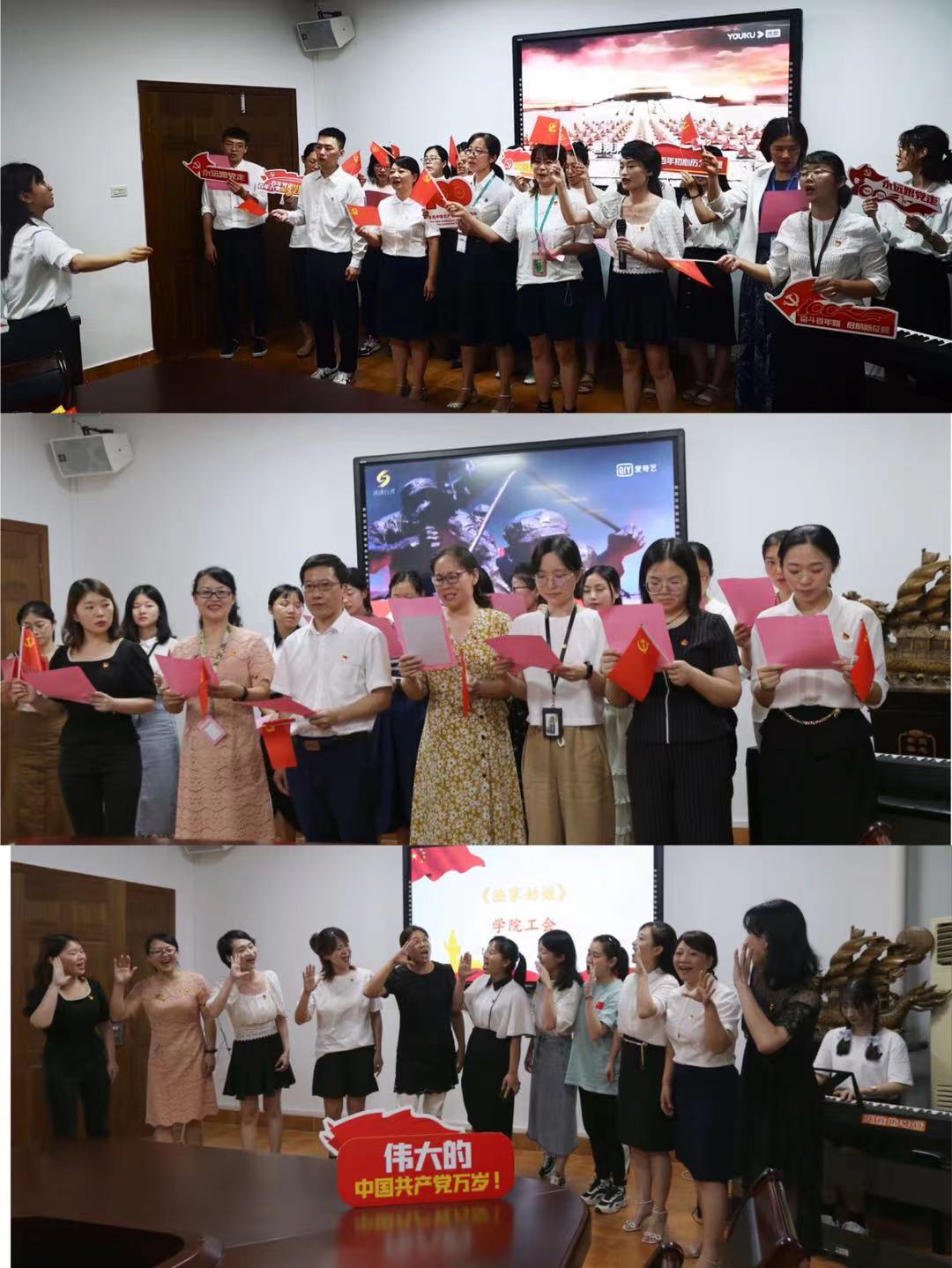 活动在全体教职员工齐唱《没有共产党就没有新中国》的歌声中圆满结束。学院今后将持续推动党史学习教育和立德树人共同发力、深度融合,引导师生从党的光辉历史中汲取力量,传承红色基因,赓续精神血脉,守正创新谋发展,以更加昂扬奋进的姿态,奋力开启学院高质量发展新篇章。