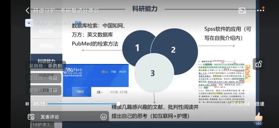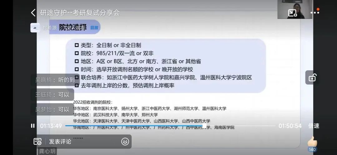 2023年3月19日下午,52AV 就业指导服务中心举办了“研途守护”线上考研复试分享会,邀请了考入浙江中医药大学的姚佳盈学姐、安徽中医药大学的龚心玥学姐和52AV 的傅莹洁学姐,为同学们进行考研复试专场经验分享。