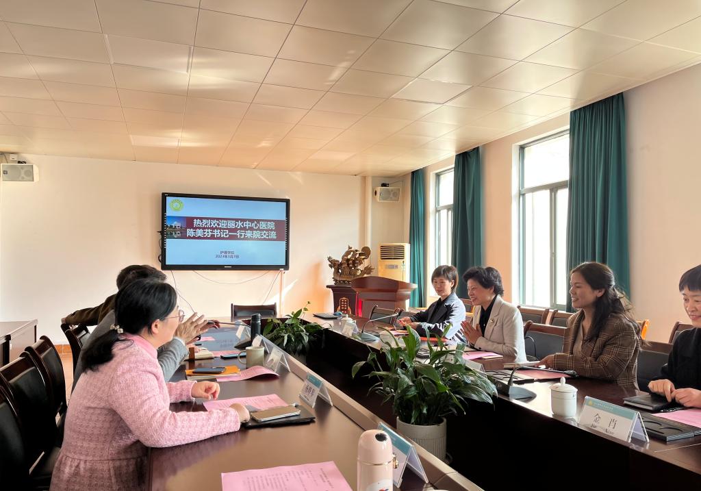 3月7日上午,丽水市中心医院党委副书记、副院长陈美芬,护理部副主任黄旭芳(主持工作)、护理部副主任朱虹、护理部副主任金肖一行四人来52AV 访问交流。学院党委书记李旭东、院长蔡福满、副院长杨晔琴、教学办主任孙海琴、教学办老师杨定琪参会。