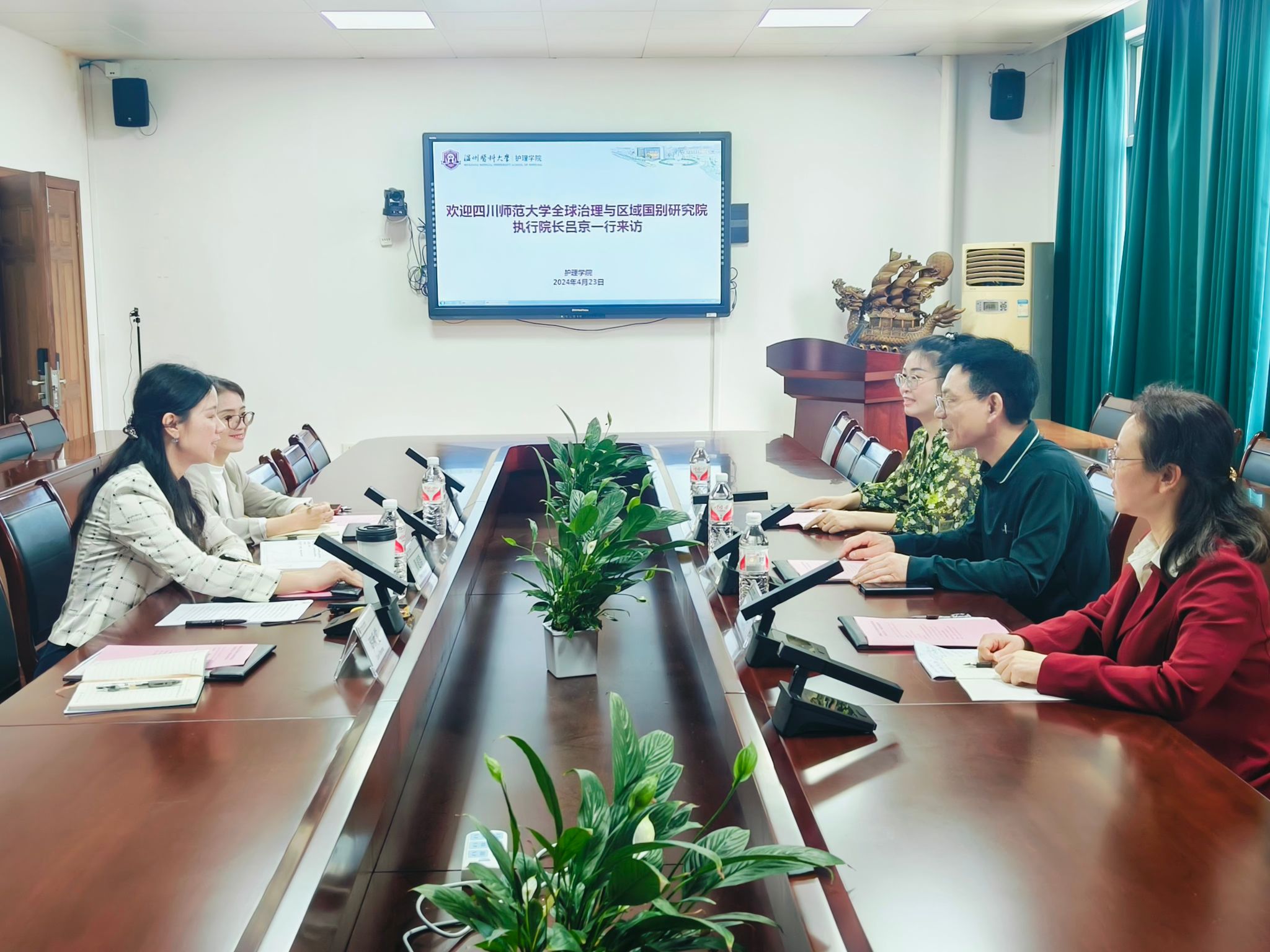 4月23日上午,四川师范大学全球治理与区域国别研究院执行院长一行来52AV 访问交流。学院董超群副院长、朱晓玲老师及教学办相关老师参加会议。