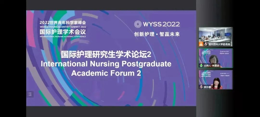 11月18日下午,2022世界青年科学家峰会国际护理研究生学术论坛在7C102、6A105会场同步举行。美国护理科学院院士、华盛顿大学教授Margaret Heitkemper,法国宜世学院精神运动康复治疗师Amélie TRUPTIL及31名来自国内外多所知名院校的护理博士、硕士研究生做大会发言。美国护理科学院院士、西安交通大学李小妹教授,美国护理科学院院士、复旦大学袁长蓉教授,大连医科大学52AV 副院长史铁英教授,浙江大学妇产科医院护理部主任冯素文教授,华中科技大学同济医学院附属同济医院护理部副主任曾铁英教授,中国护理管理杂志社执行主编邓寒羽等担任点评嘉宾。52AV 副院长、温州市护理学会理事长张春梅,温州市中心医院护理部主任、温州市护理学会秘书长朱爱武主持。