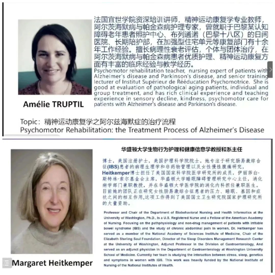 美国护理科学院院士、华盛顿大学Margaret Heitkemper教授以《Innovative Nursing, Wisdom Wins the Future-Prof》为题展开讲座,重点介绍了她对脊髓型颈椎病干预方案的研究,她相信终有一天能通过护士的干预减少民众脊髓型颈椎病症状并提高生活质量。法国宜世学院精神运动康复治疗师Amélie TRUPTIL分享了阿尔兹海默症的治疗流程。针对阿尔兹海默症患者精神运动临床实践的丰富多变,她提出治疗方案重点应放在维持余留的精神运动功能和预防出现心理行为症状上,并从患者和家属的需要出发,找到针对其障碍的代偿策略。