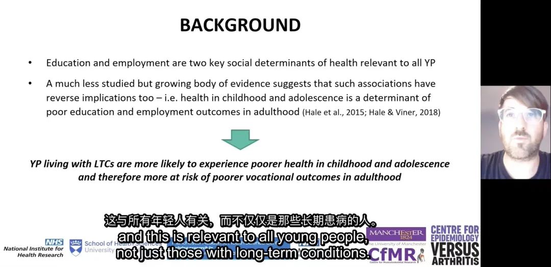 英国邓迪大学讲师Albert Farre博士作《解决在医疗环境中长期患病的年轻人的职业发展:循证实践建议》专题讲座。他指出教育和就业是公认健康的社会决定因素,越来越多的证据显示,长期患病的年轻人教育和就业结果不佳的可能性更大。他根据定性及定量的研究结果,使用主题合成法综合数据的方法,建立了一整套干预措施。其中被证明确实有效的7项,分别是提供心理支持、提供信息、提供专门针对教育或就业的技能培训、提供专业职业建议、与教育或工作场所的关键利益者联系、提供或更便利的获得社会支持以及提供灵活的护理和最佳的疾病管理。