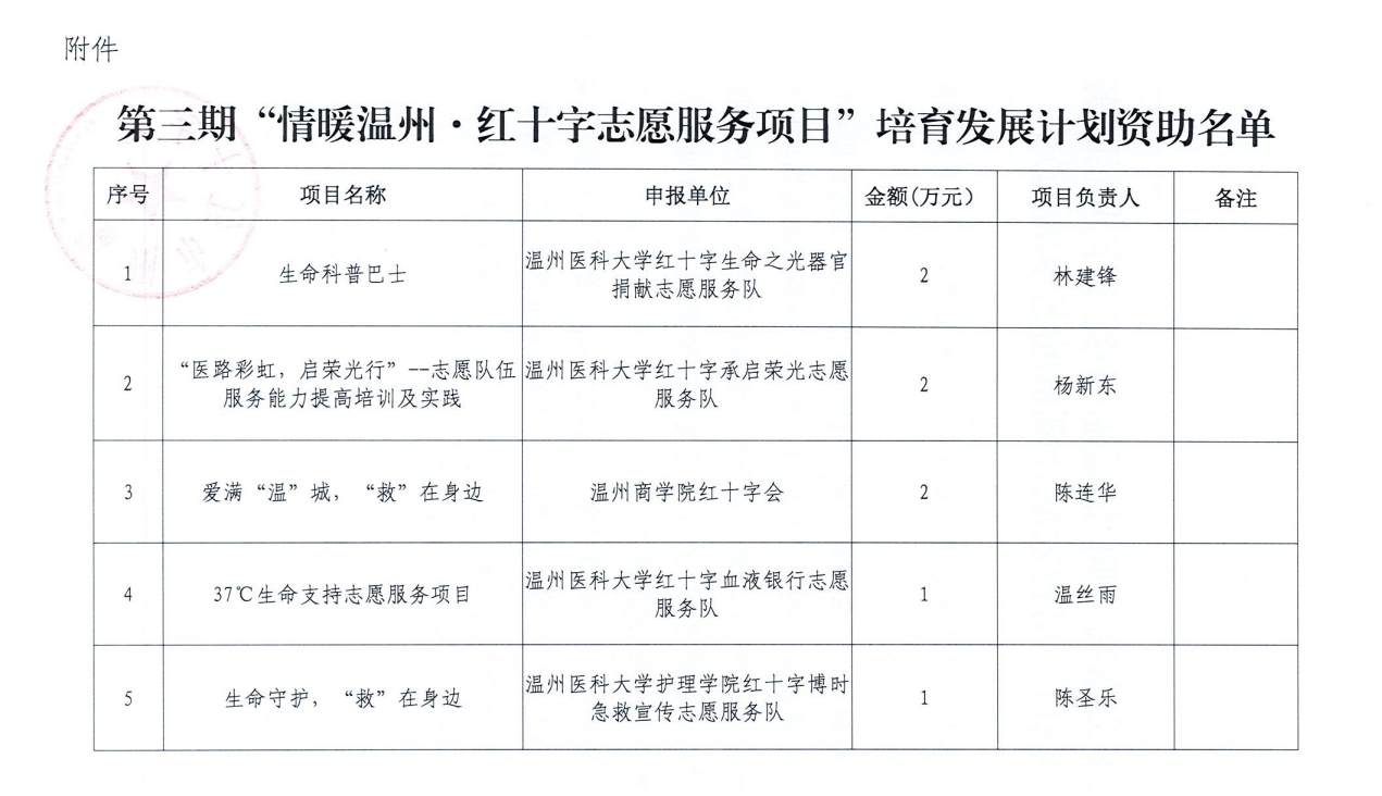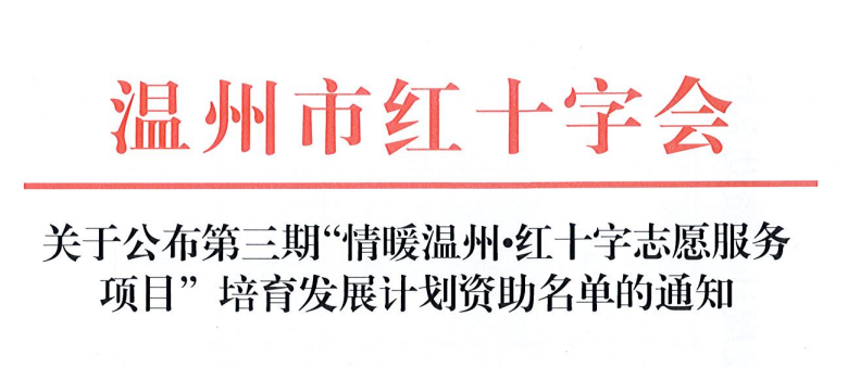 据悉,本次温州市红十字会第三期“情暖温州红十字志愿服务项目”培育发展计划为力求取得良好社会效益,为打造温州市红十字志愿服务品牌奠定坚实基础。面向全市高校进行项目申报,最终共遴选出5个项目。
