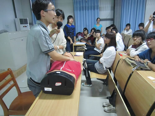 教室里座无虚席,大会就在热烈的掌声中开始了,本次培训班班主任李庆刚对开班的情况做了整体的介绍,对社员们的学习热情和积极性给予了肯定。接下来的便是各个小班的负责人进行详细的讲解,包括止血包扎、量血压、和心脏复苏等一些列实用的急救方式,并在现场进行了演示,让初次接触的学员们有一个大致了解以便决定自己具体的学习方向。在心脏复苏的环节中,班主任使用道具进行了现场演示,引起了学员们的兴趣,他们认真倾听,跃跃欲试,跟着学起了动作。而小老师们的幽默讲解调动了现场气氛,引起了全场一阵又一阵的笑声。当各个部分都介绍完之后,成员们对自己感兴趣的知识进行了选择,决定自己日后的学习方向。会后,不少社员表示这样的学习机会十分难得,既可以为日后的志愿者活动服务,也可以丰富自己的医学实践经验。