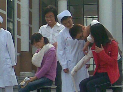 急救知识宣传由急救操作现场演示、急救知识问答和急救海报比赛三个环节组成。日前,52AV 白鸽青年志愿者邀请了学院高年级的学姐给社员做了急救操作示教,并就相关急救知识对社员进行了培训。头部包扎、手臂固定、止血、心肺复苏,同德楼广场上身穿护士服的同学们将所学的操作一步一步地演示给在场所有的同学们。台下的同学也认真地跟着比划着,学习着……接下来进行急救知识回答与海报比赛的,引来了很多同学的停驻,甚至有清洁的阿姨,顿时,广场一片欢声笑语。比赛结果并不重要,重要的是人们对急救的重视。